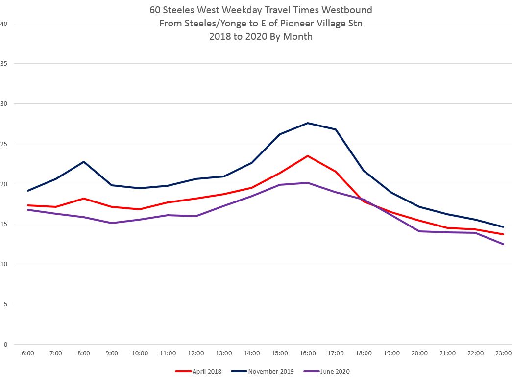 Between Yonge and Pioneer Village Station, the longest travel times occurred in November 2019, and there is a drop to post-covid levels in June 2020. If these values hold up as traffic returns, there will be a definite benefit from bus lanes especially eastbound in the PM peak. Whether the street can absorb the effect of losing a lane in each direction is a separate matter. By the evening, there is little difference in the values.