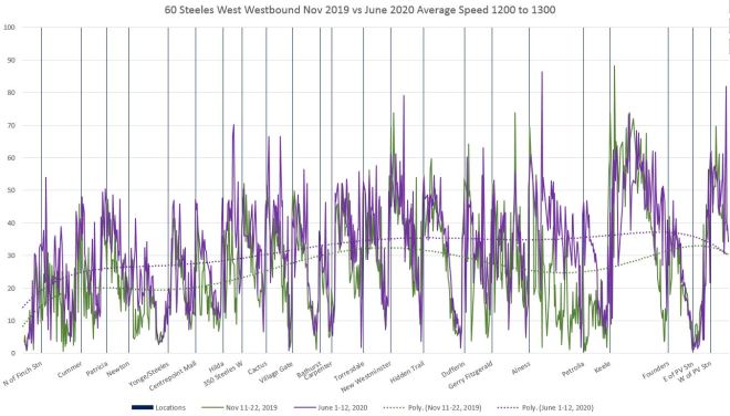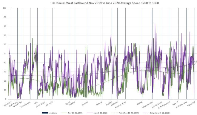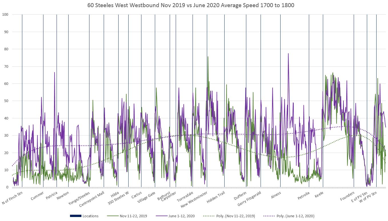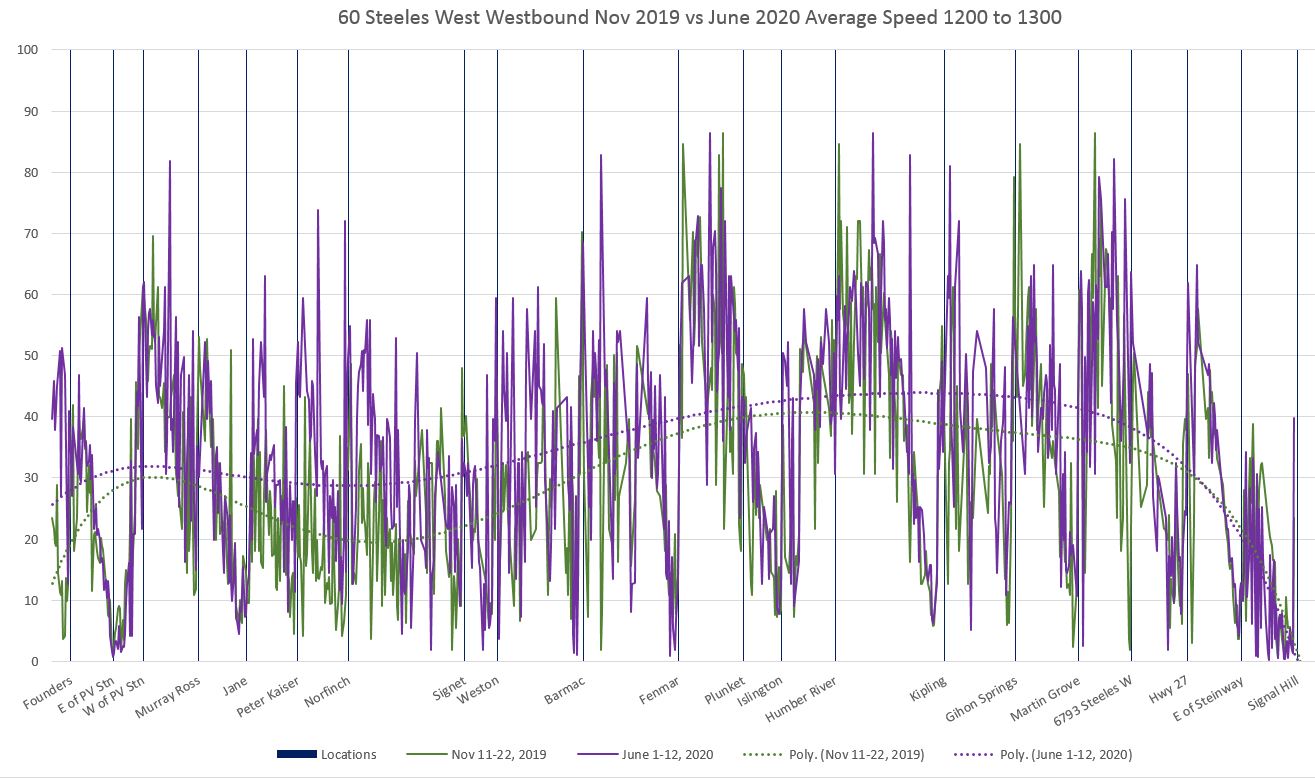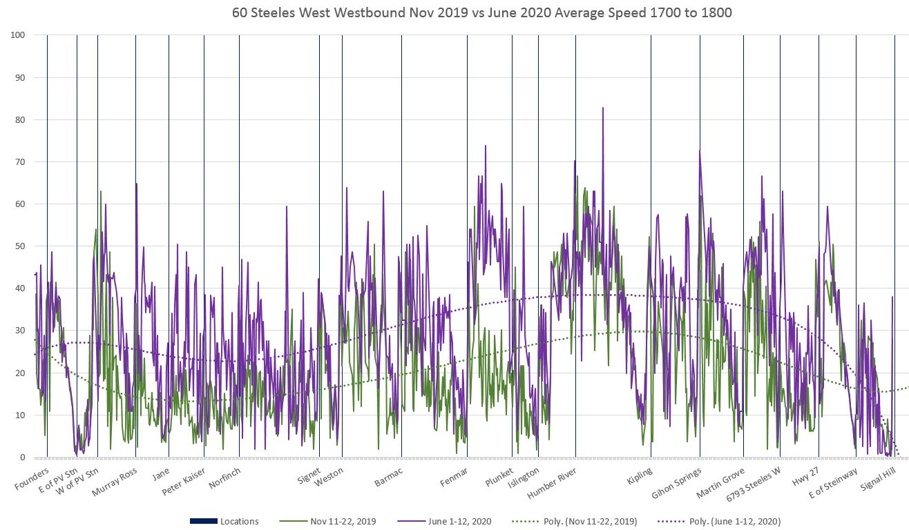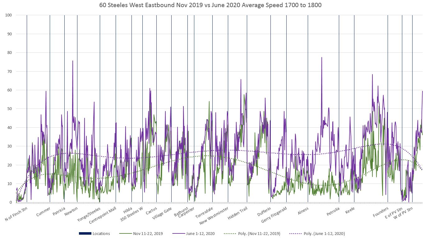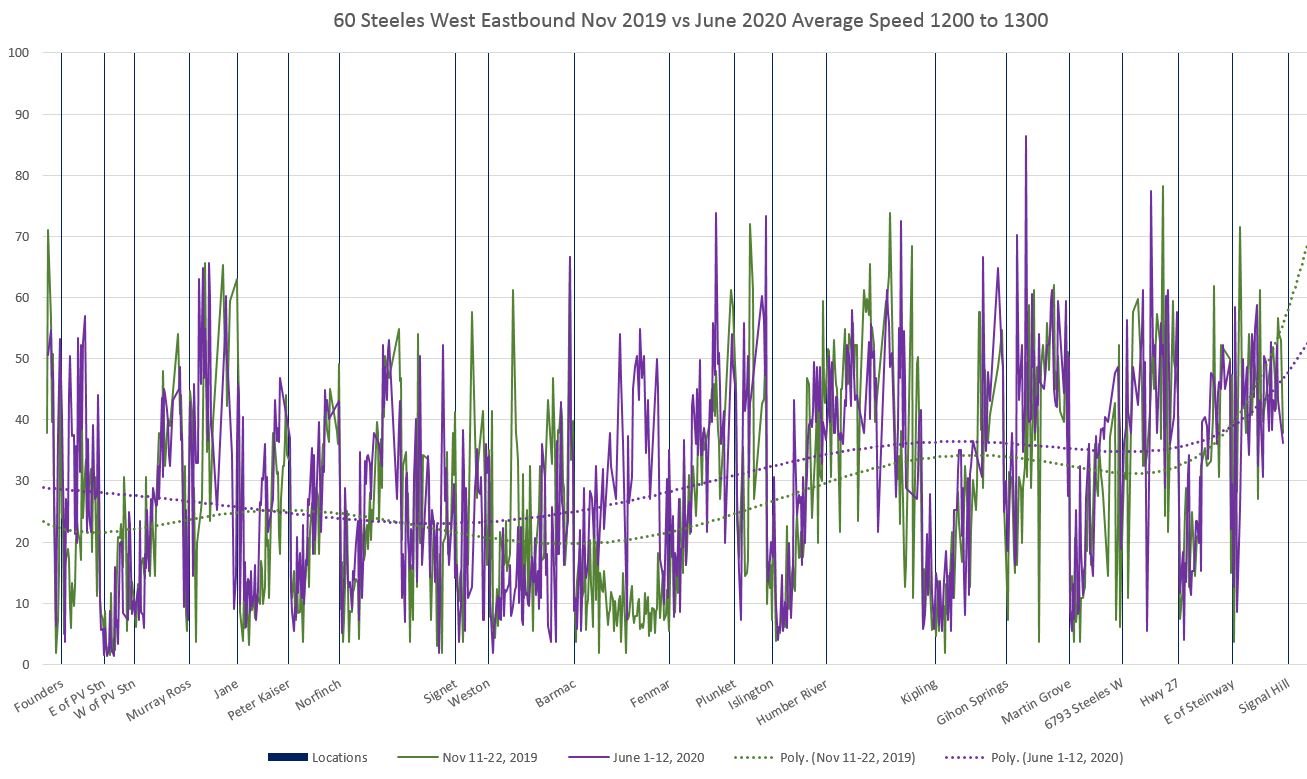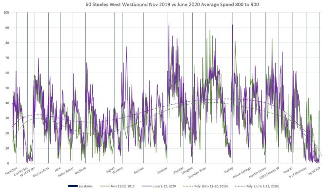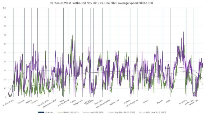 In the AM peak hour from 8 to 9, there are only a few locations where westbound speeds are better in the June 2020 data compared to November 2011, but eastbound is different story. Between Kipling and Jane, travel speeds in the 2019 data are consistently below those for June 2020.