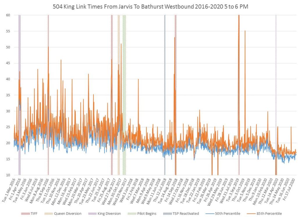 The King Street Transit Priority “Pilot” has been in place since fall 2017, and is now a permanent fixture. Long time readers will know that I have tracked the changes in travel times through the affected area between Bathurst and Jarvis Streets for many years.