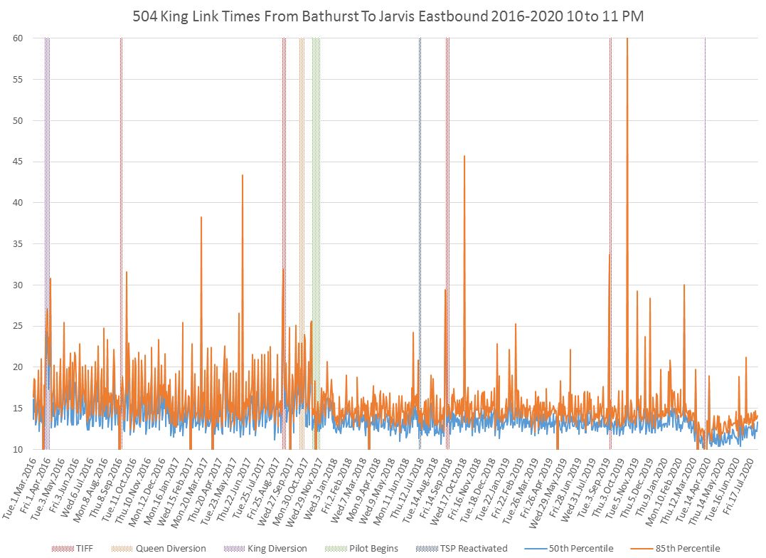 There is a drop in travel times even in the 10 to 11 PM hour both ways on King, although a gradual rise is visible corresponding to the limited resumption of street activity in the Entertainment District.