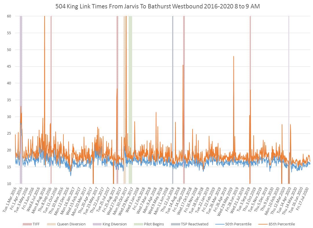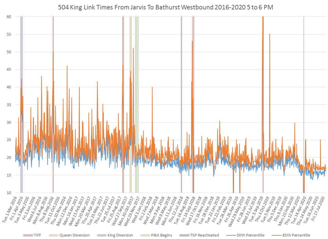 The King Street Transit Priority “Pilot” has been in place since fall 2017, and is now a permanent fixture. Long time readers will know that I have tracked the changes in travel times through the affected area between Bathurst and Jarvis Streets for many years.