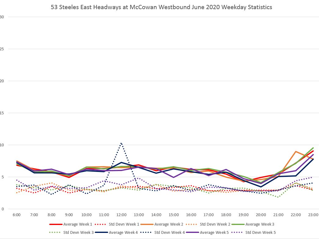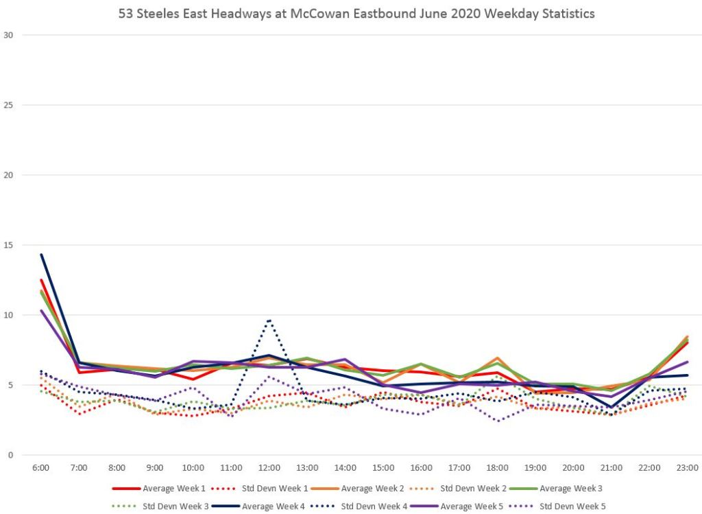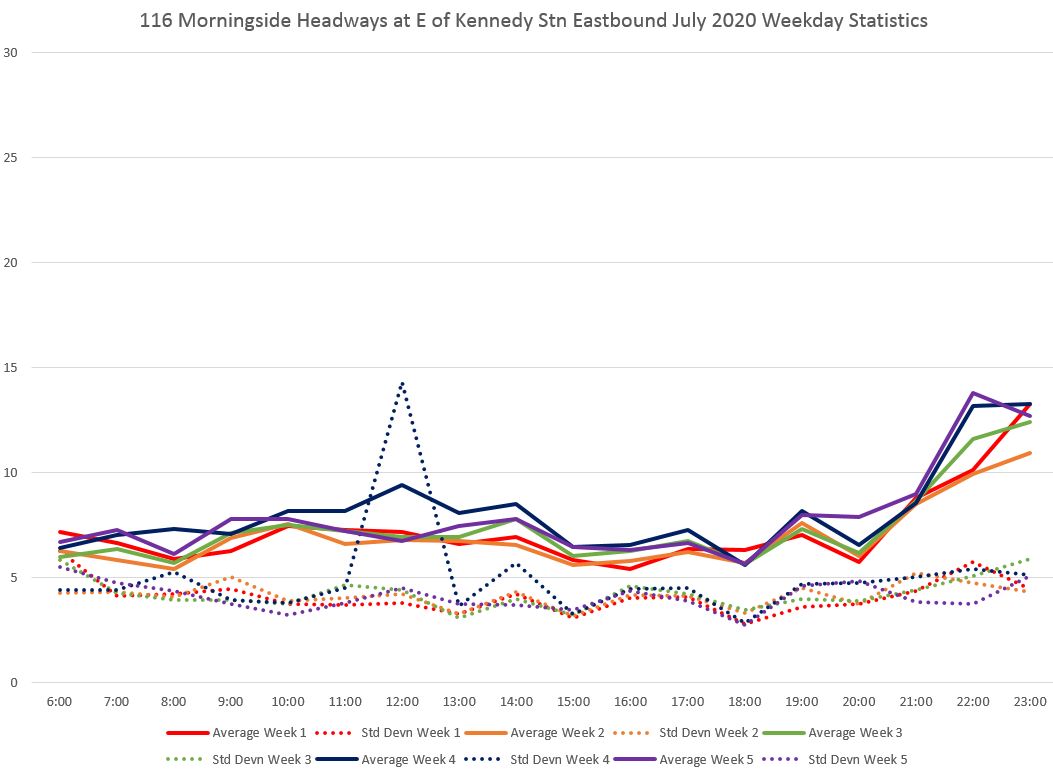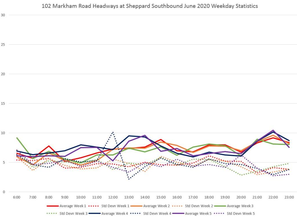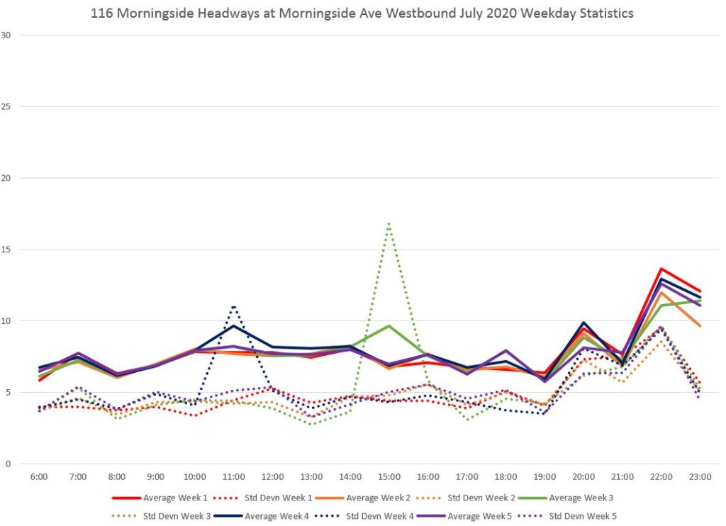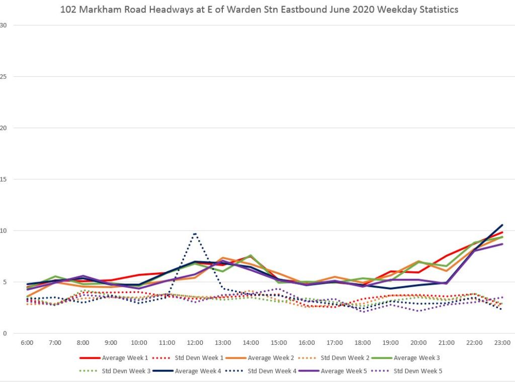 Further along the route, at Morningside and Kingston Road, the average headway is lower, but the standard deviations run at about four minutes, close to the average, showing that bunching is common.