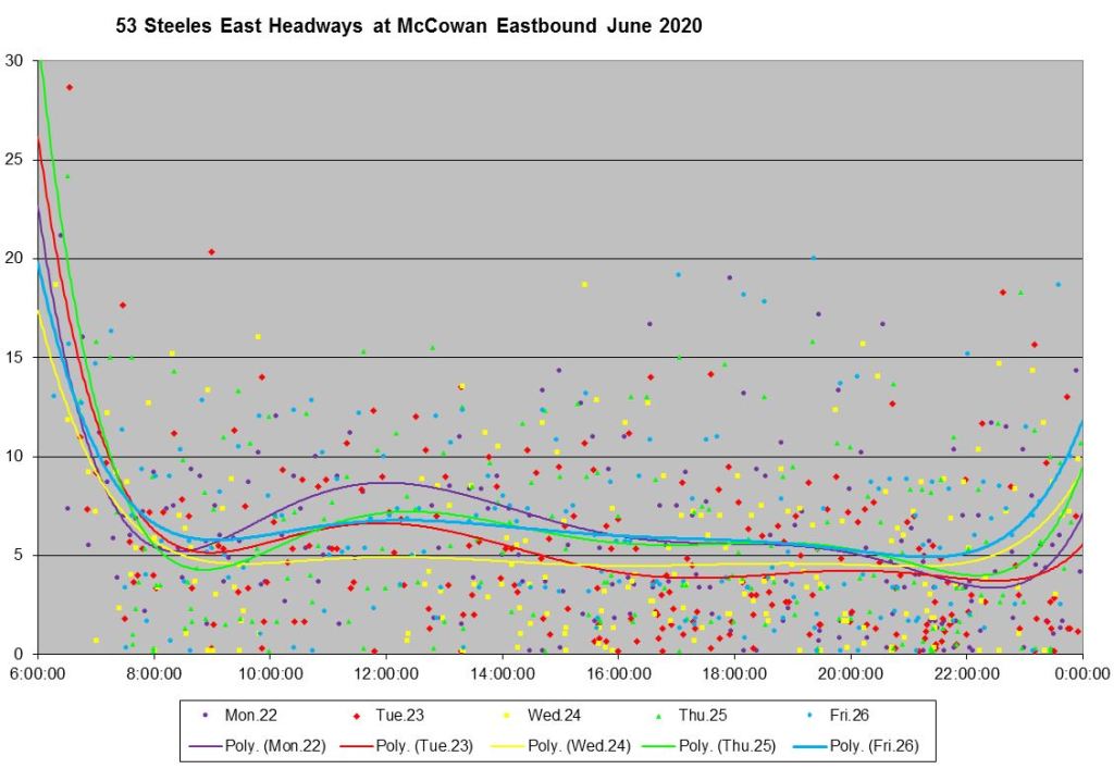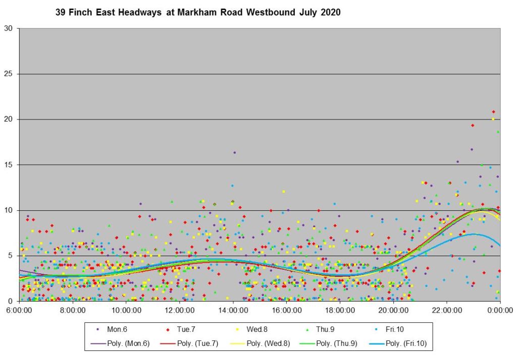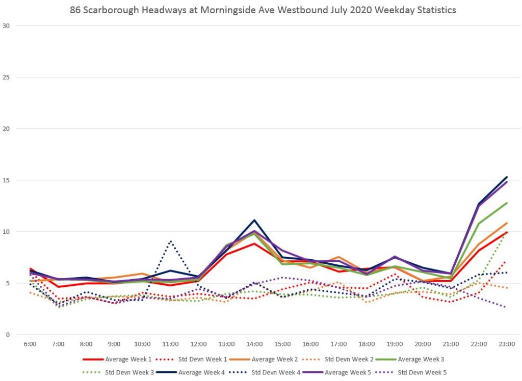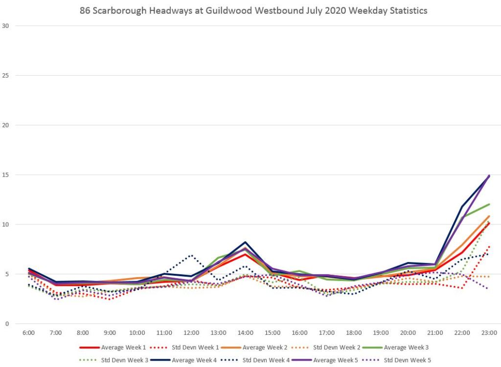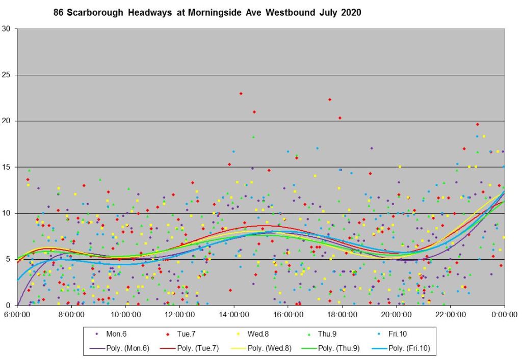 (As with the 86 Scarborough route above, note that headways are marshalled by the traffic signal where at the screenline where they are measured east of the GO overpass.)