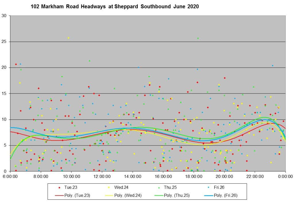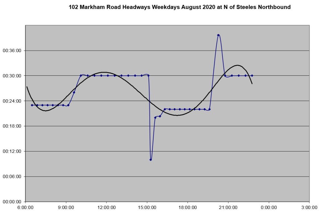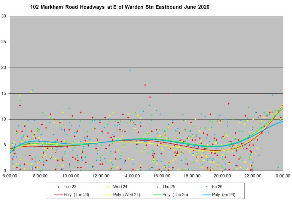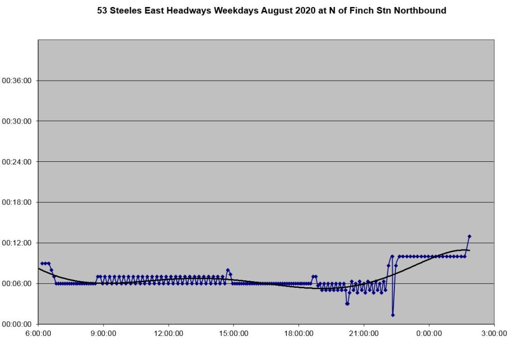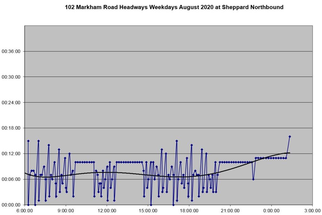 (As with the 86 Scarborough route above, note that headways are marshalled by the traffic signal where at the screenline where they are measured east of the GO overpass.)