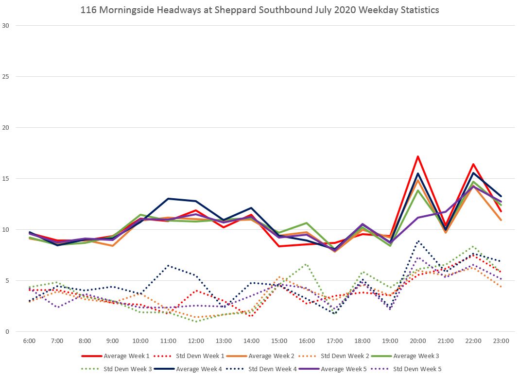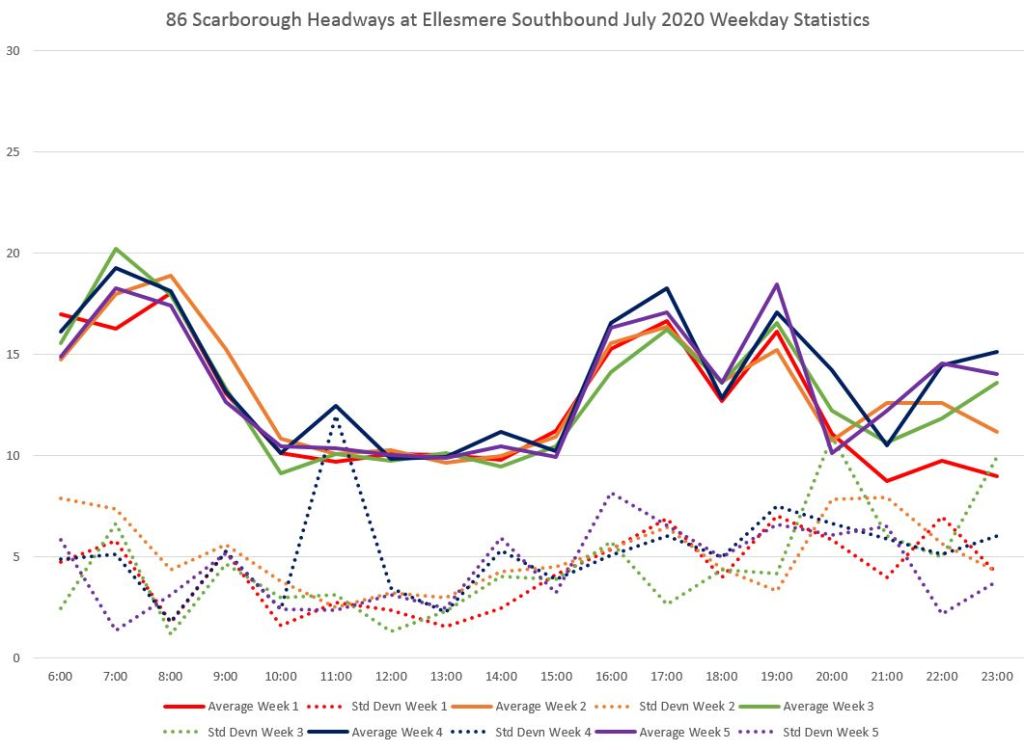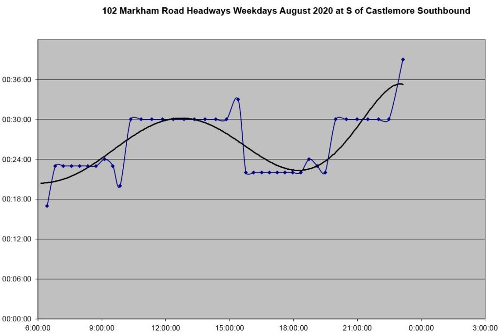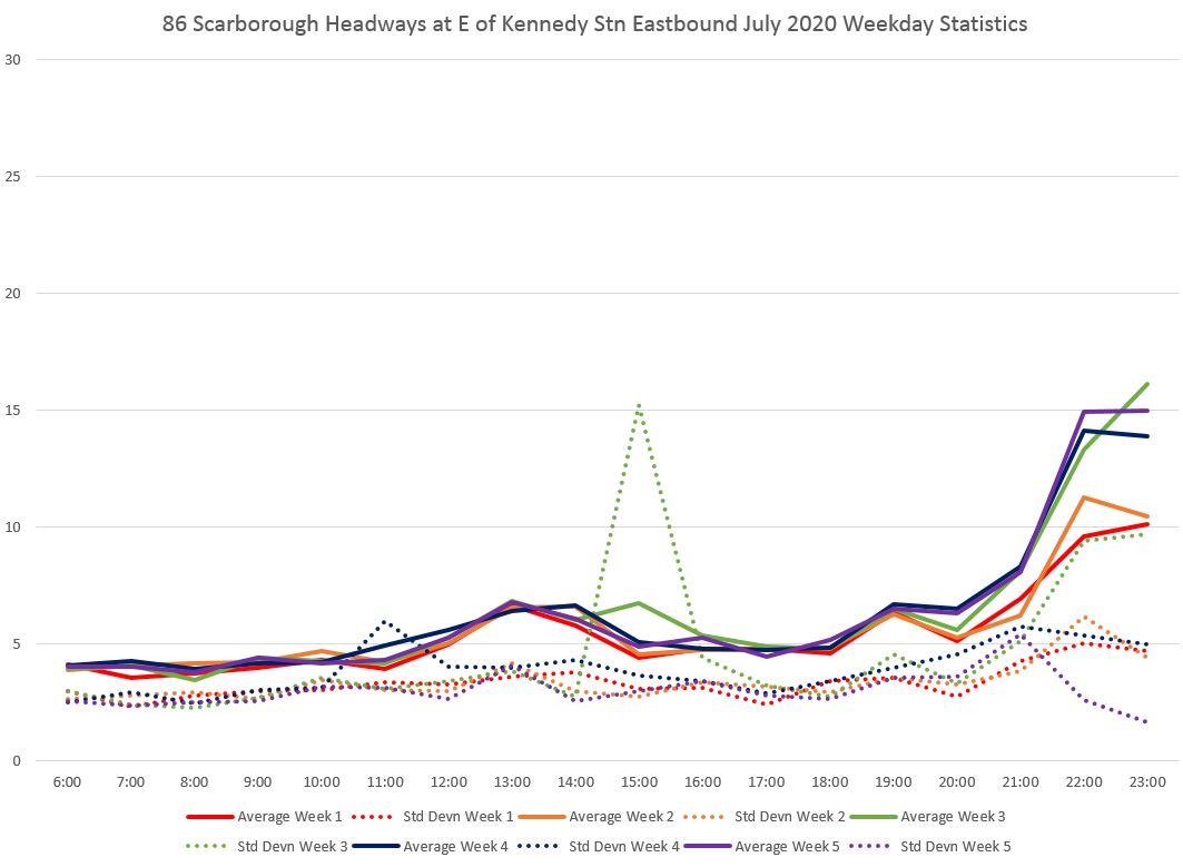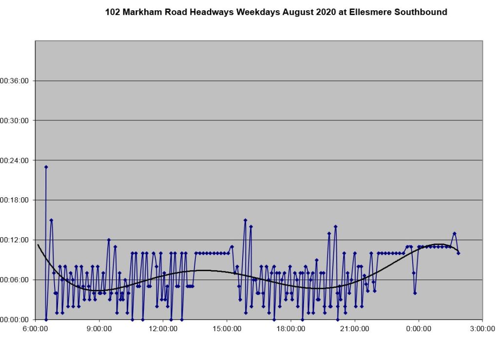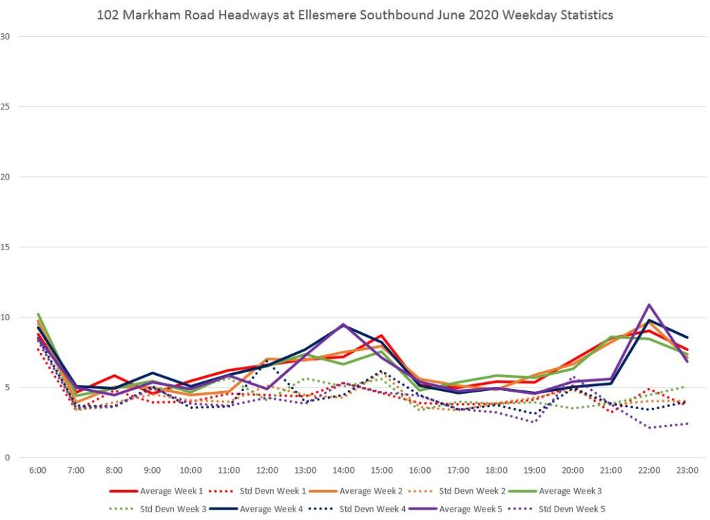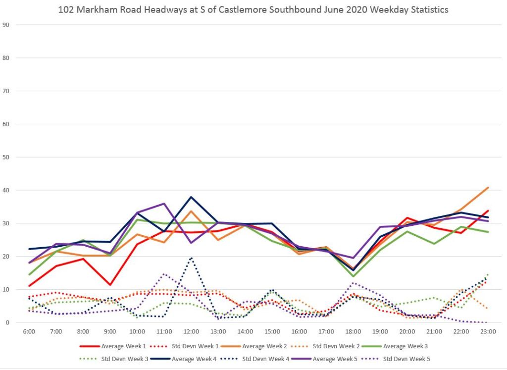In July 2020, southbound at Ellesmere, the actual headways, as shown above, are better in the midday than in the peak period because peaks formerly included the 986 Scarborough express service. Throughout the day, the standard deviation of headways is high and it grows as the day goes on showing that headway values are widely scattered even though this is not far south of the terminal for most service.