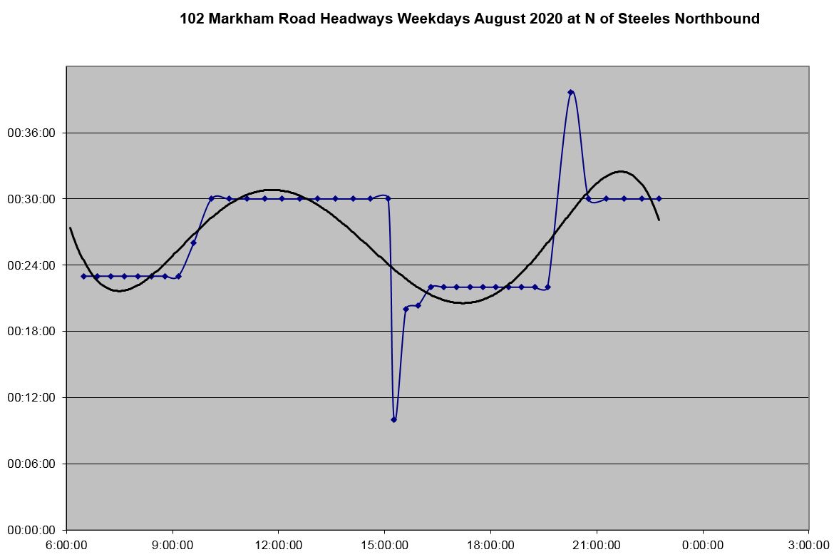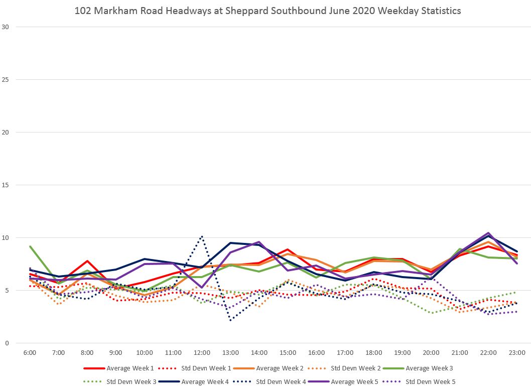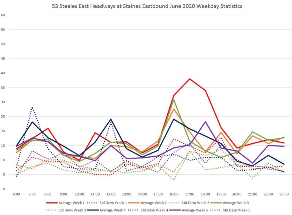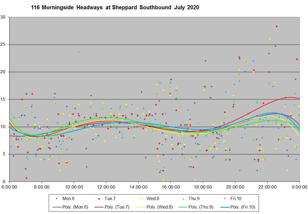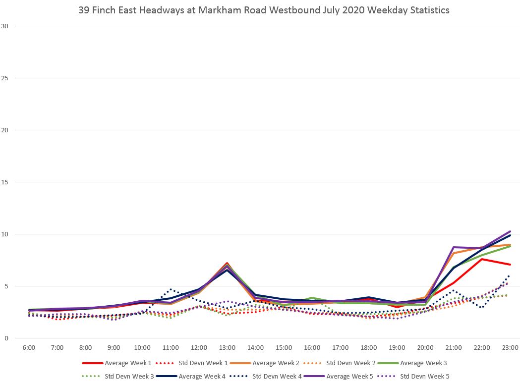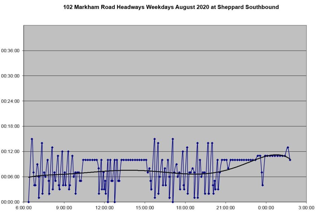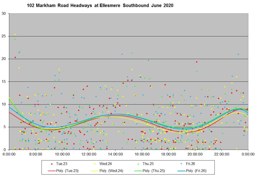 In July 2020, southbound at Ellesmere, the actual headways, as shown above, are better in the midday than in the peak period because peaks formerly included the 986 Scarborough express service. Throughout the day, the standard deviation of headways is high and it grows as the day goes on showing that headway values are widely scattered even though this is not far south of the terminal for most service.
