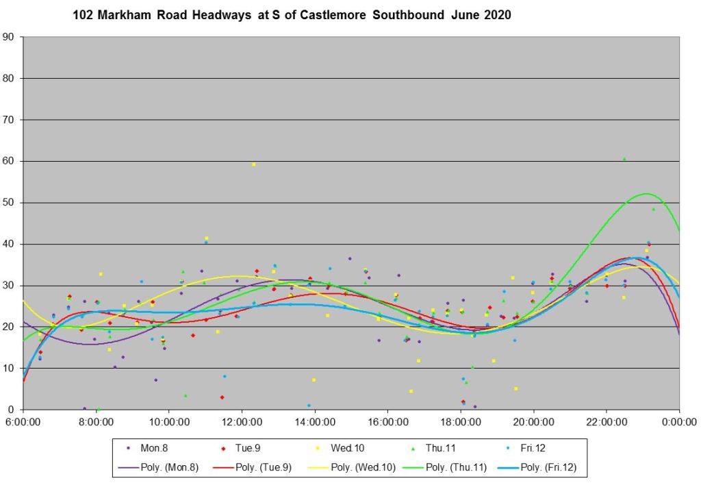 For the charts at Castlemore (south of Major Mackenzie), note that the Y-axis runs to 90 minutes whereas on other charts it runs only to 30. This is go give headroom for the wider headways north of Steeles to fit.