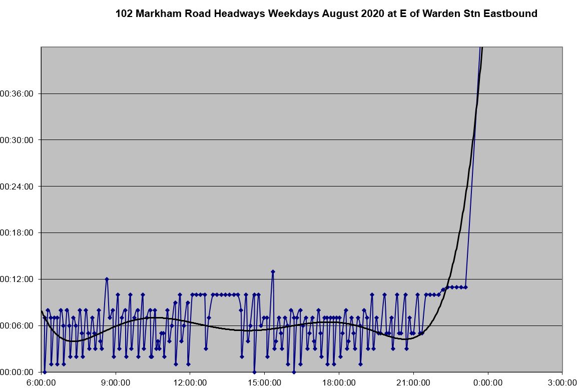 By the time we reach Morningside and Kingston Road, there is a tripper service mixed in and the headways bounce around, except for a roughly two-hour period in early afternoon when there are no trippers.
