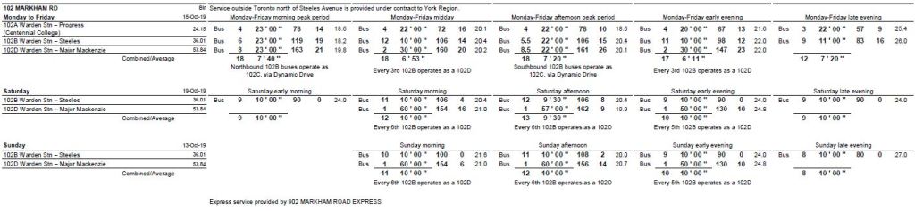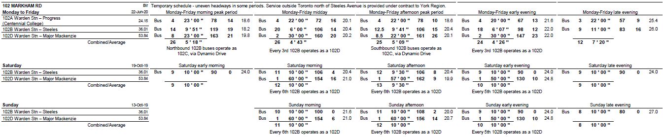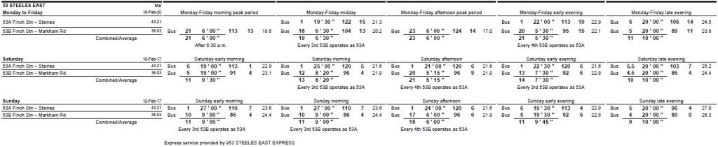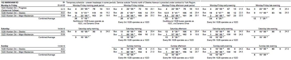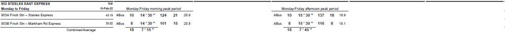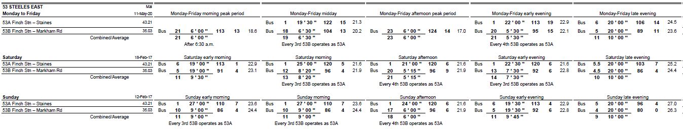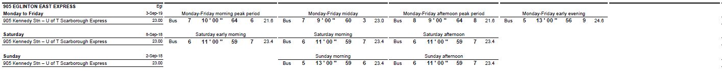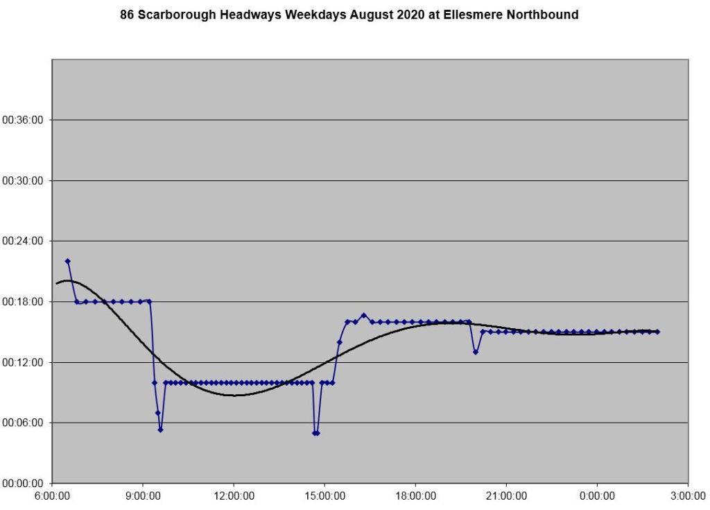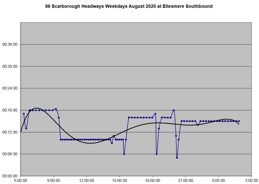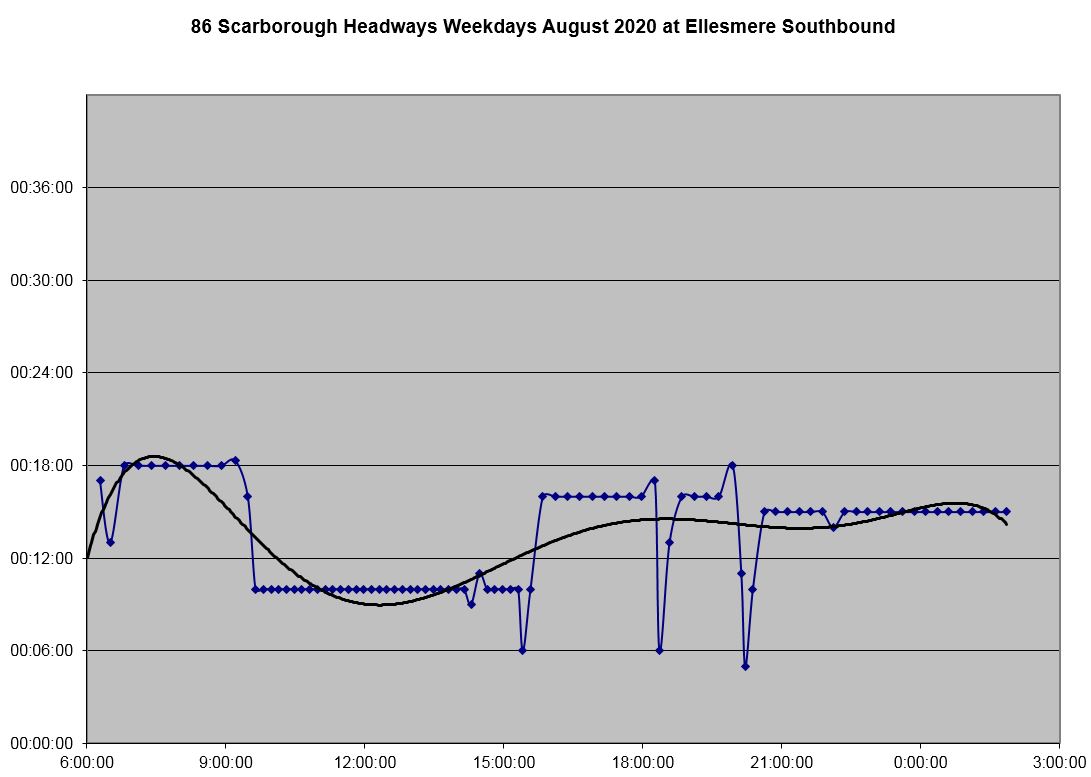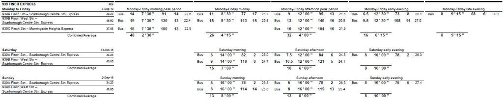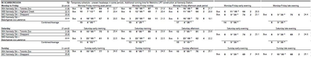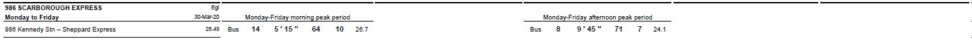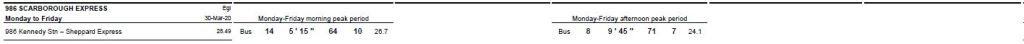 Because only one service runs north to Ellesmere, the headways are fairly consistent. However, the off-peak service is more frequent than the peak service, a leftover from the March schedules when there was also a 986 express service running north to Sheppard.