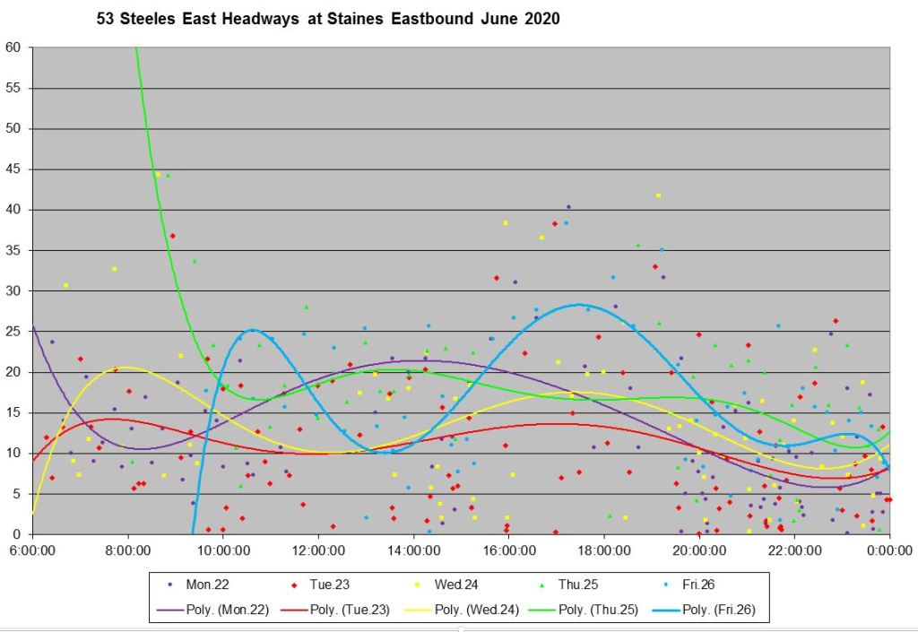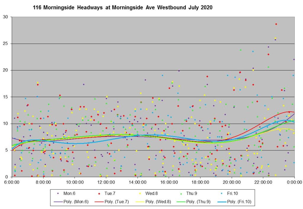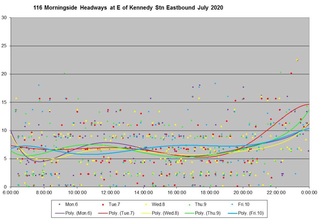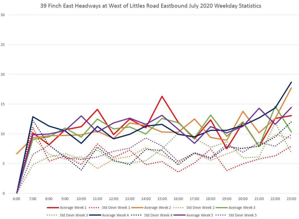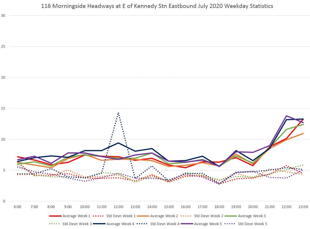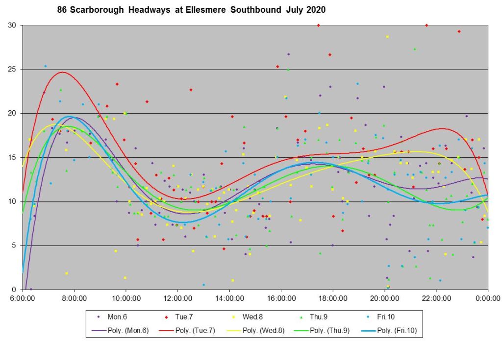 This chart shows the data for week 2 in July 2020. Headways are unreliable especially in the afternoon and evening.