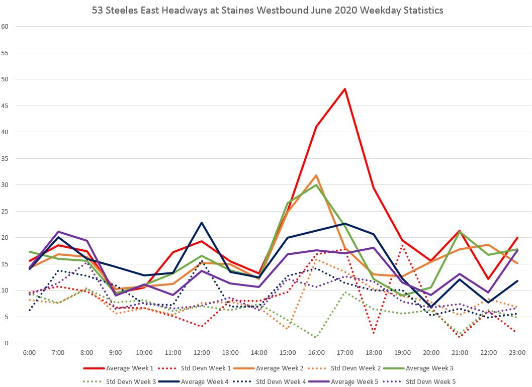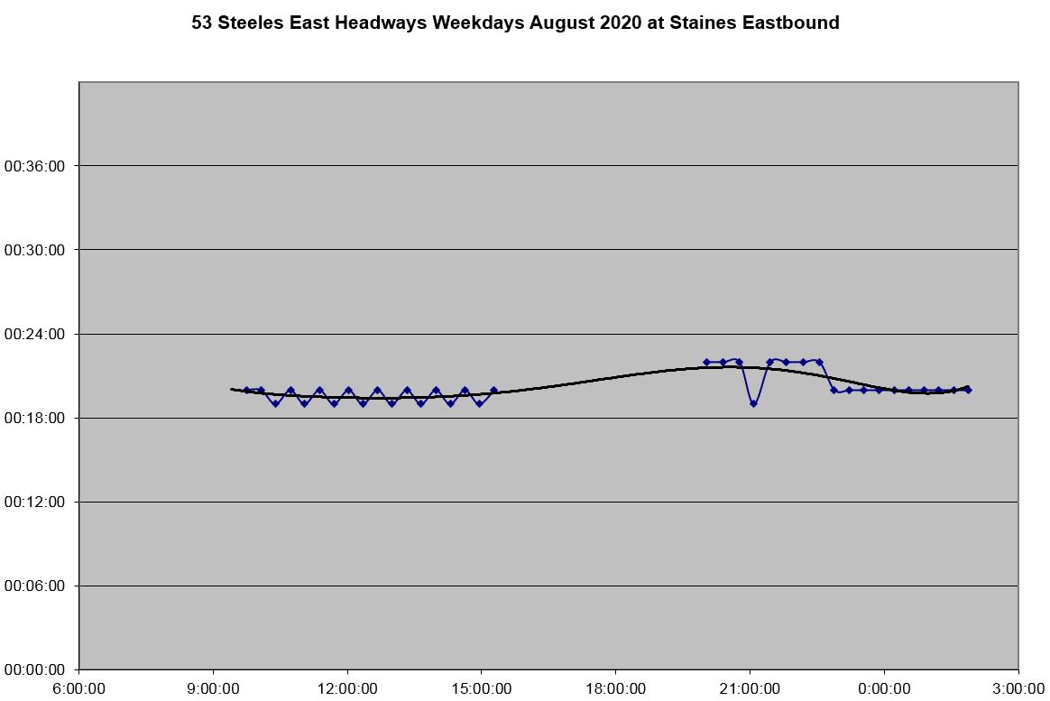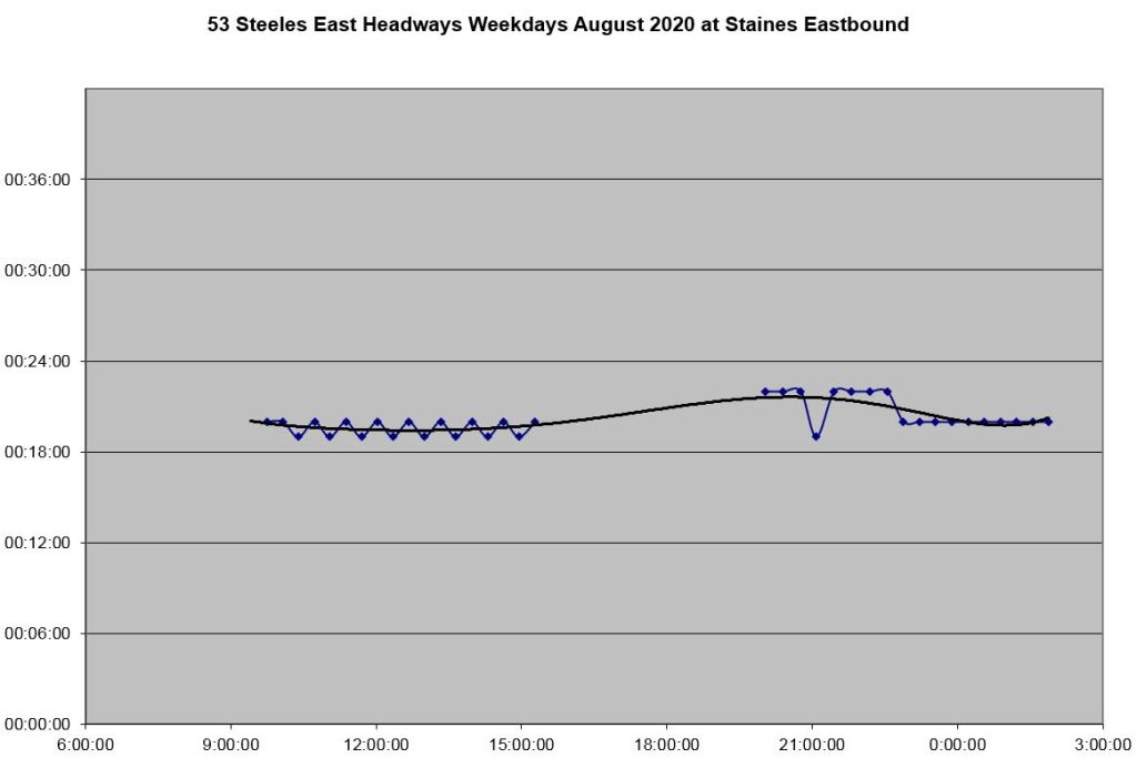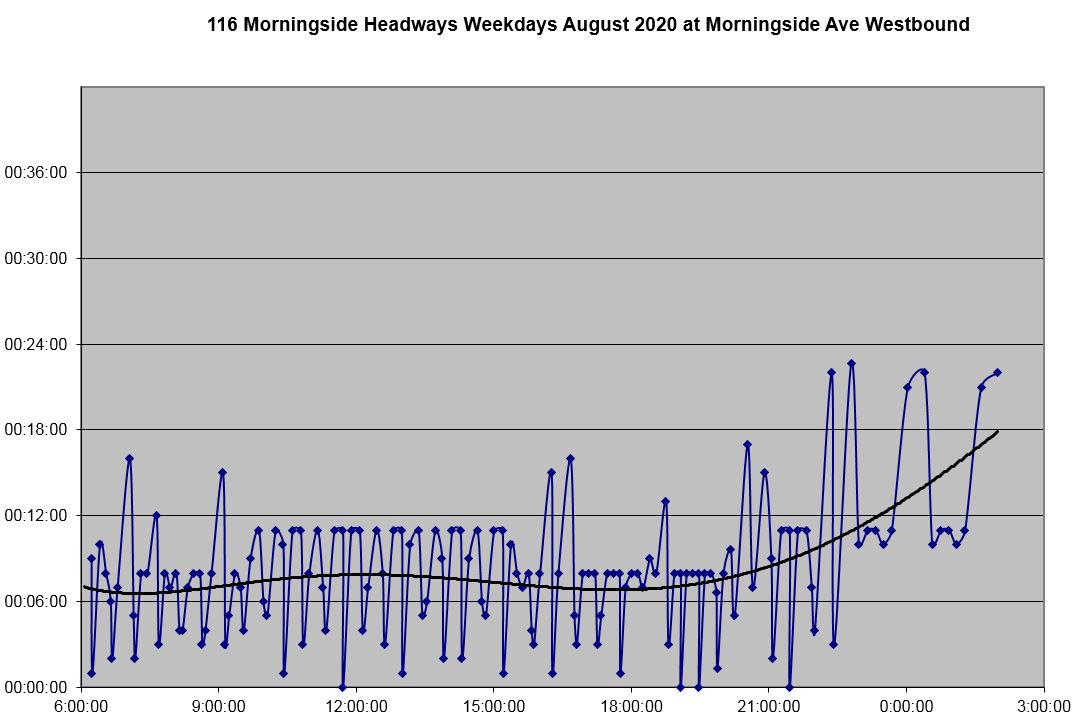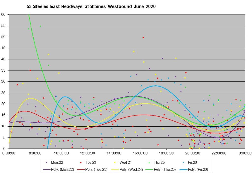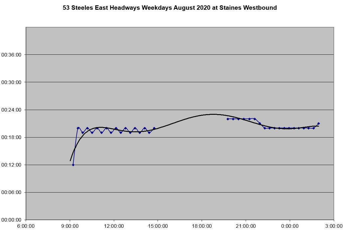 This chart shows the data for week 2 in July 2020. Headways are unreliable especially in the afternoon and evening.