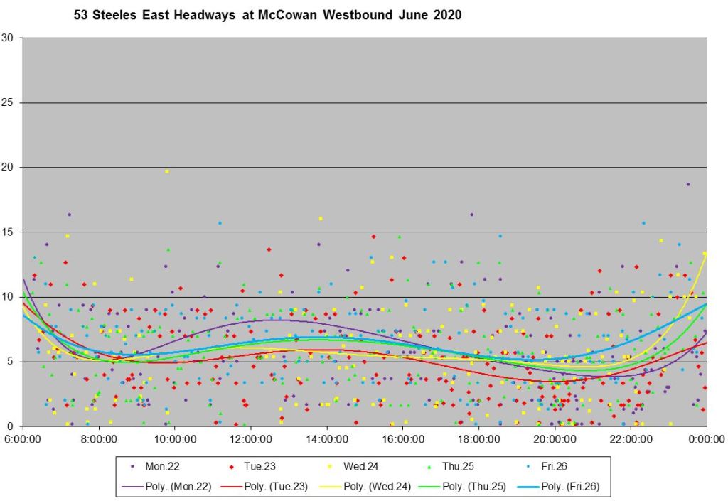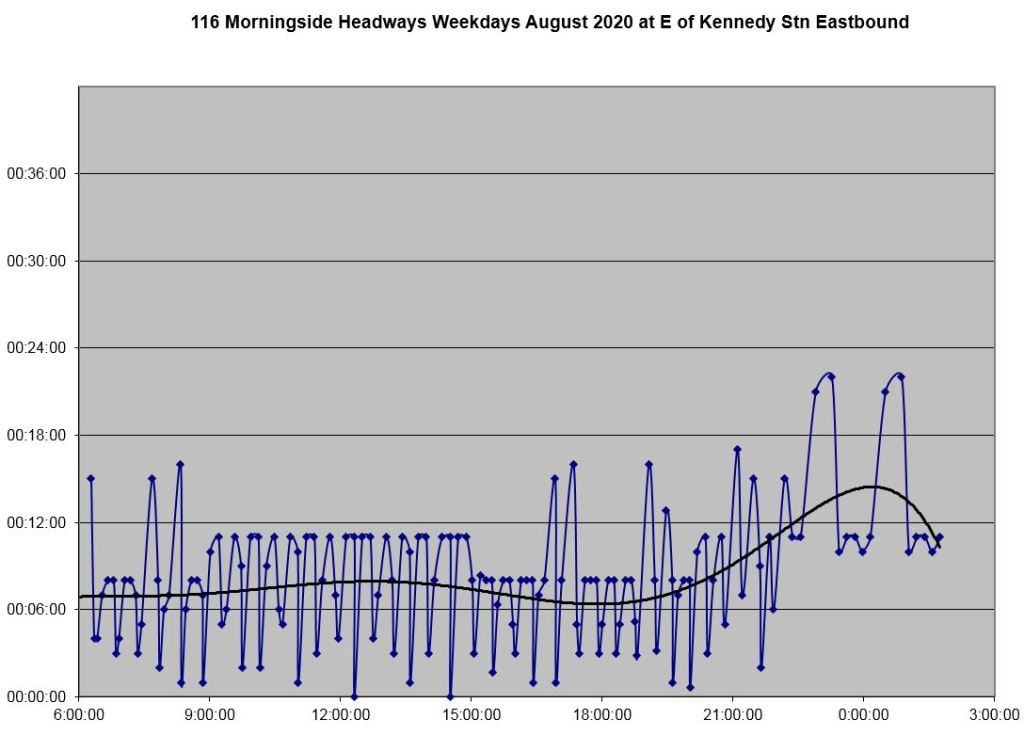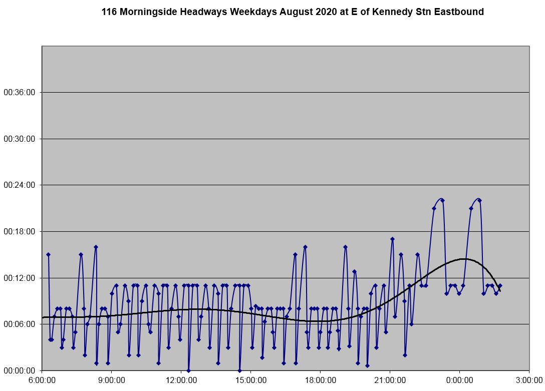 The headways eastbound at Kennedy lie in bands because the screenline for this chart is at the traffic signal just east of the overpass on Eglinton over the GO corridor. Service is marshalled into bunches at this location by the signal cycles.