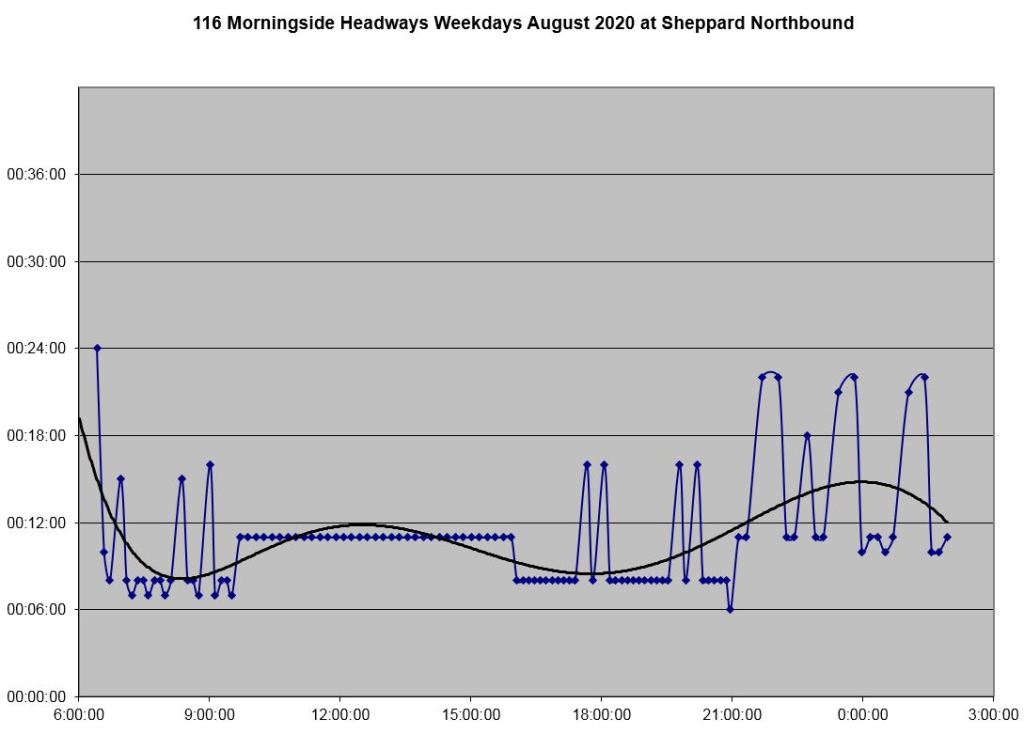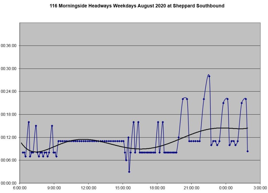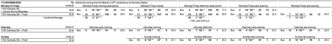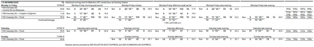 At Sheppard and Morningside southbound, there is only the 116C service. However, the selective cancellation of some runs produces scheduled gaps, some quite large, in the service.