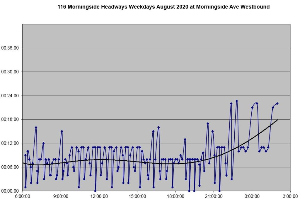In March, the 116B operated only during peak periods. Although there is no express service with the name “Morningside”, this route was overlaid by the 905 and 986 express services for parts of its length.
