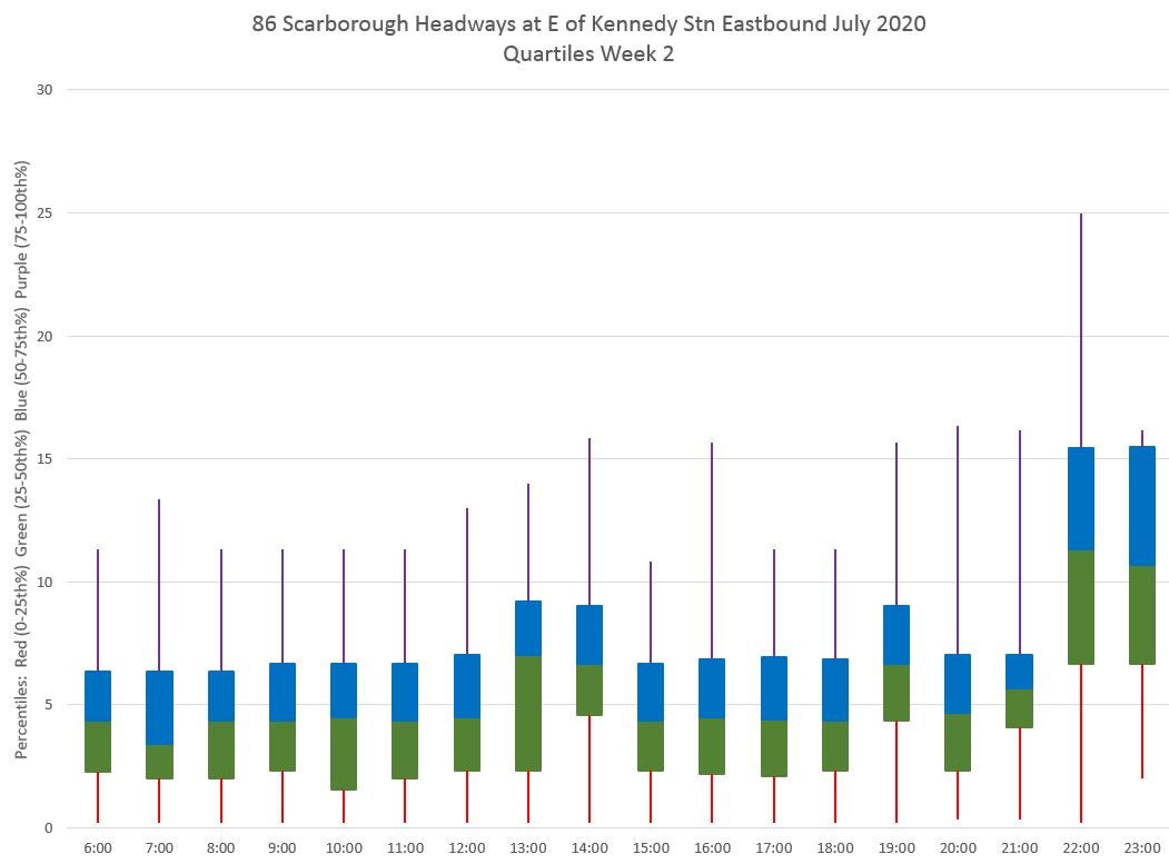There are additional charts in the sets below that illustrate the data in different ways although I have not included them in the article. Among these are charts that break down the data by quartiles. Here is the chart for week 2 of July eastbound from Kennedy Station corresponding to the raw data illustrated above.