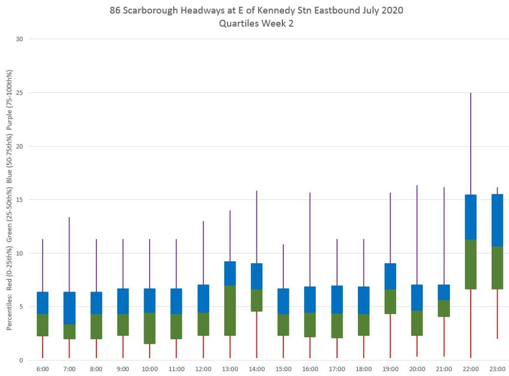 For a complete description of the various charts produced for these analyses, see Understanding TTC Service Analysis Charts: A Primer.