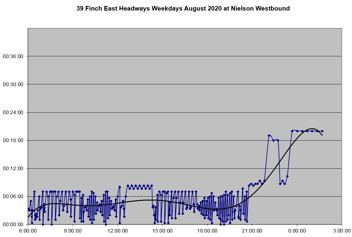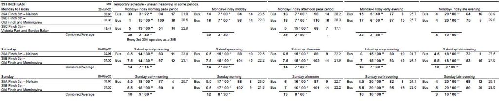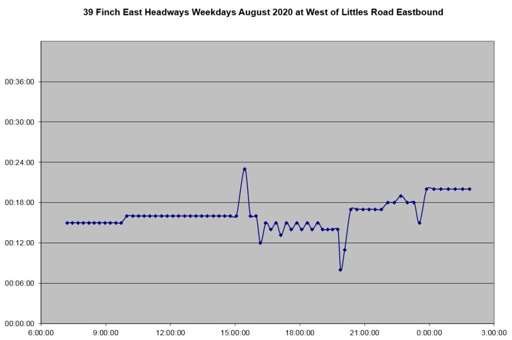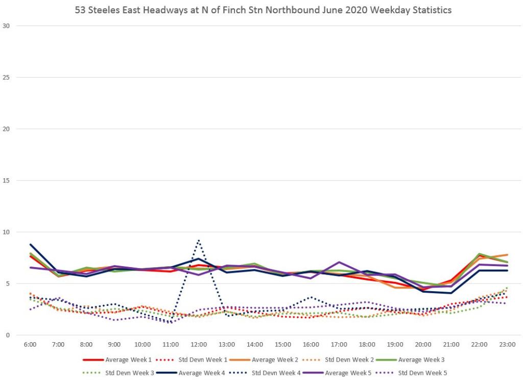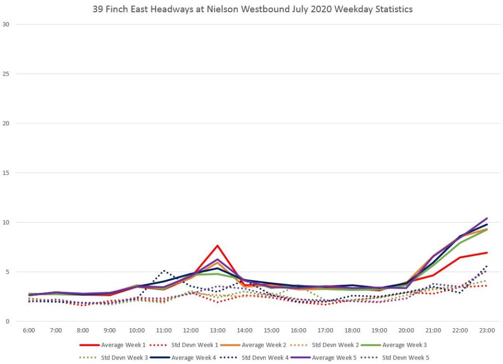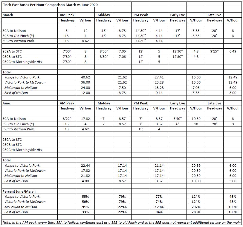 The combined scheduled service on Finch is considerably different with the removal of the express services although the degree of change varies by time of day and the portion of the route. Note also that these are scheduled values, and cancelled trips in the June schedules are not reflected here.