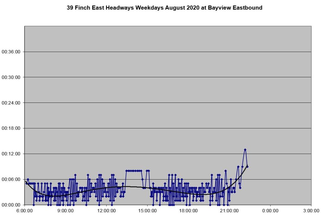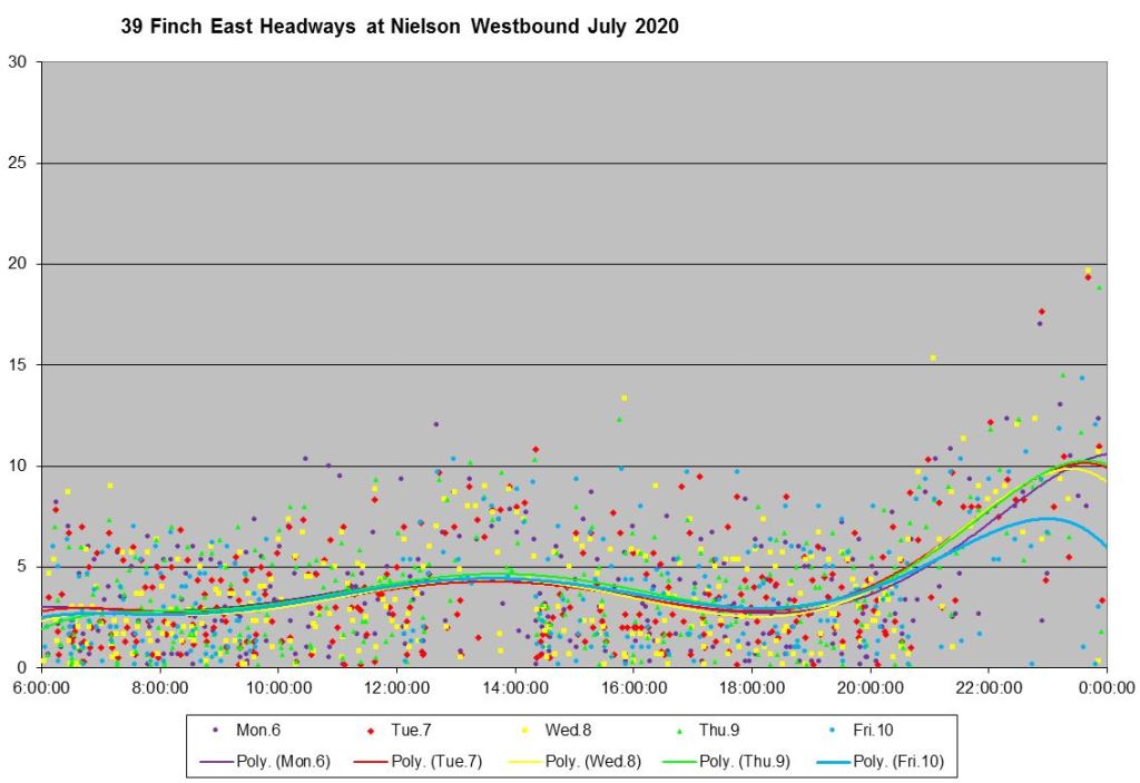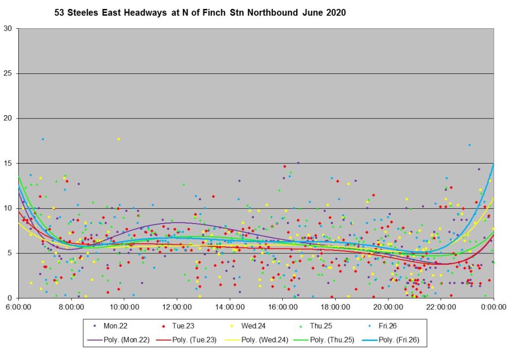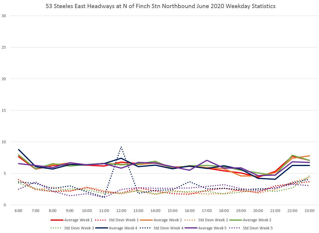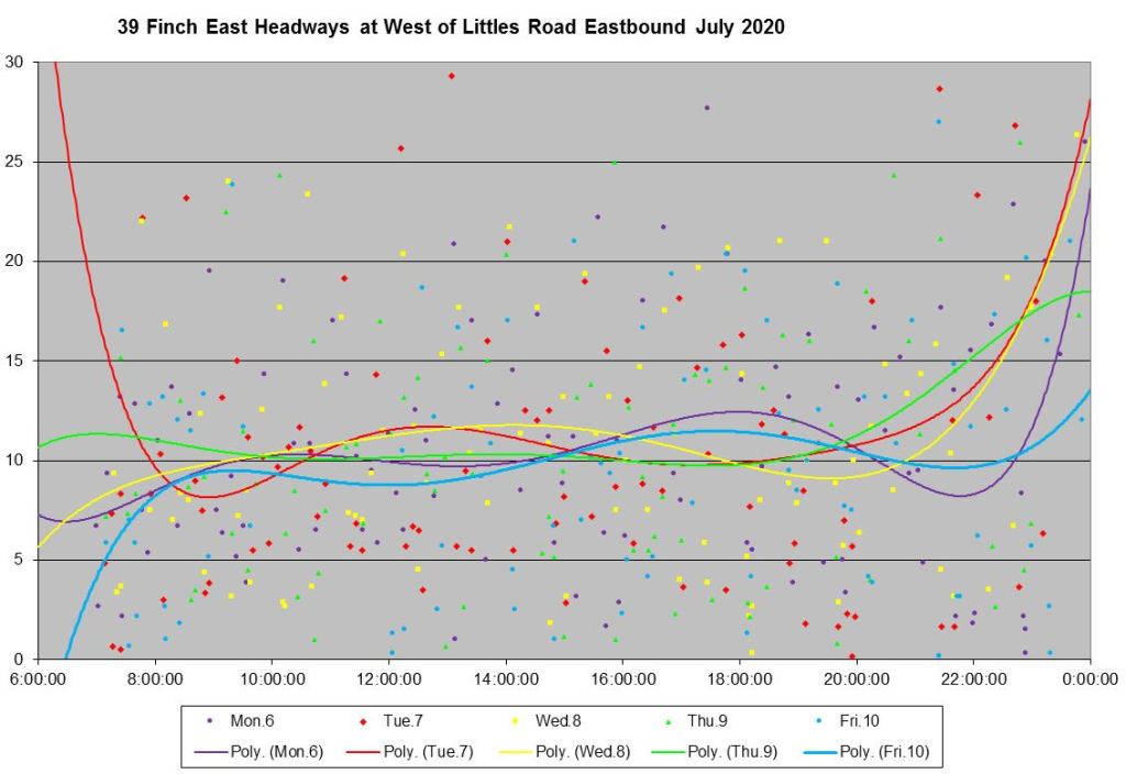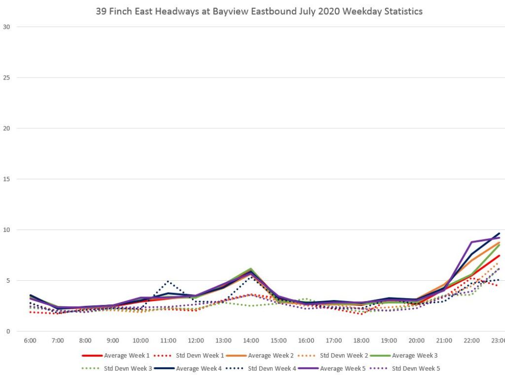 The combined scheduled service on Finch is considerably different with the removal of the express services although the degree of change varies by time of day and the portion of the route. Note also that these are scheduled values, and cancelled trips in the June schedules are not reflected here.