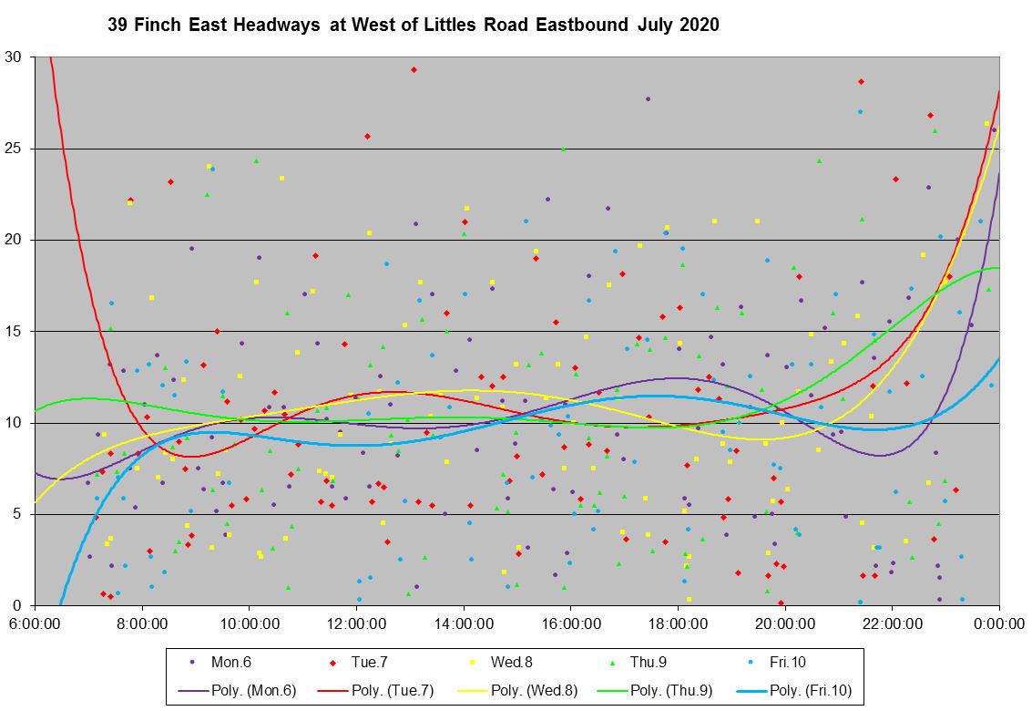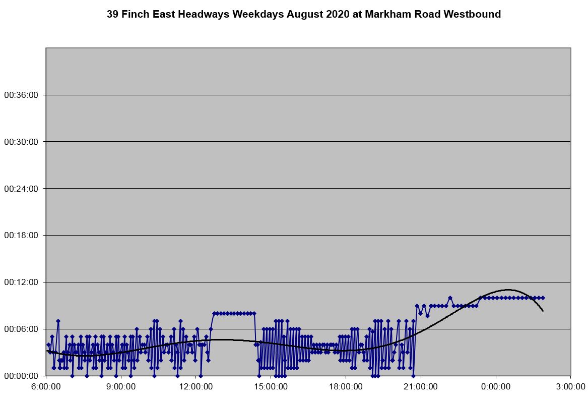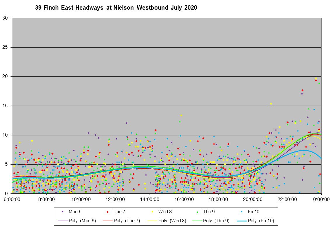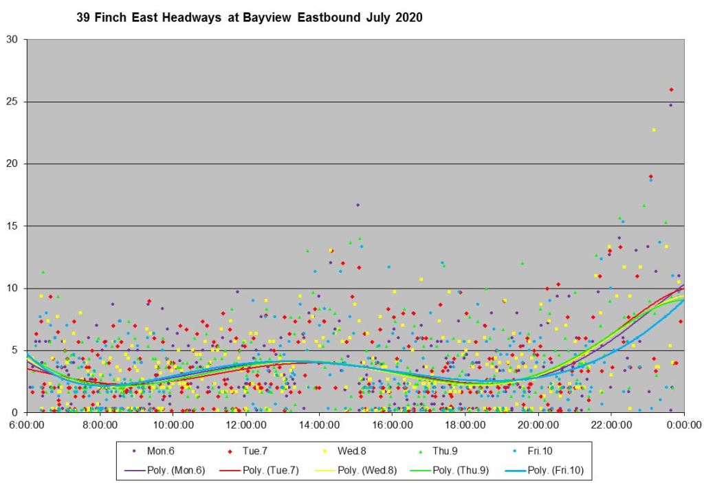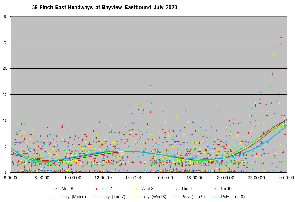 The combined scheduled service on Finch is considerably different with the removal of the express services although the degree of change varies by time of day and the portion of the route. Note also that these are scheduled values, and cancelled trips in the June schedules are not reflected here.