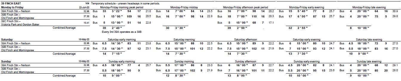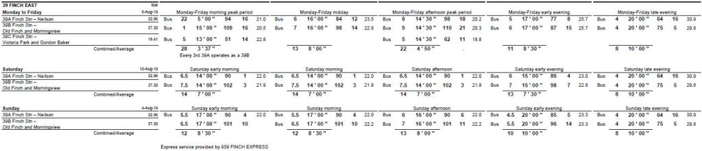 At Bayview, peak headways are shorter because the 39C Victoria Park buses are included.
