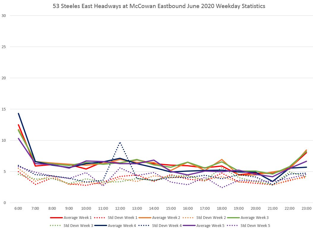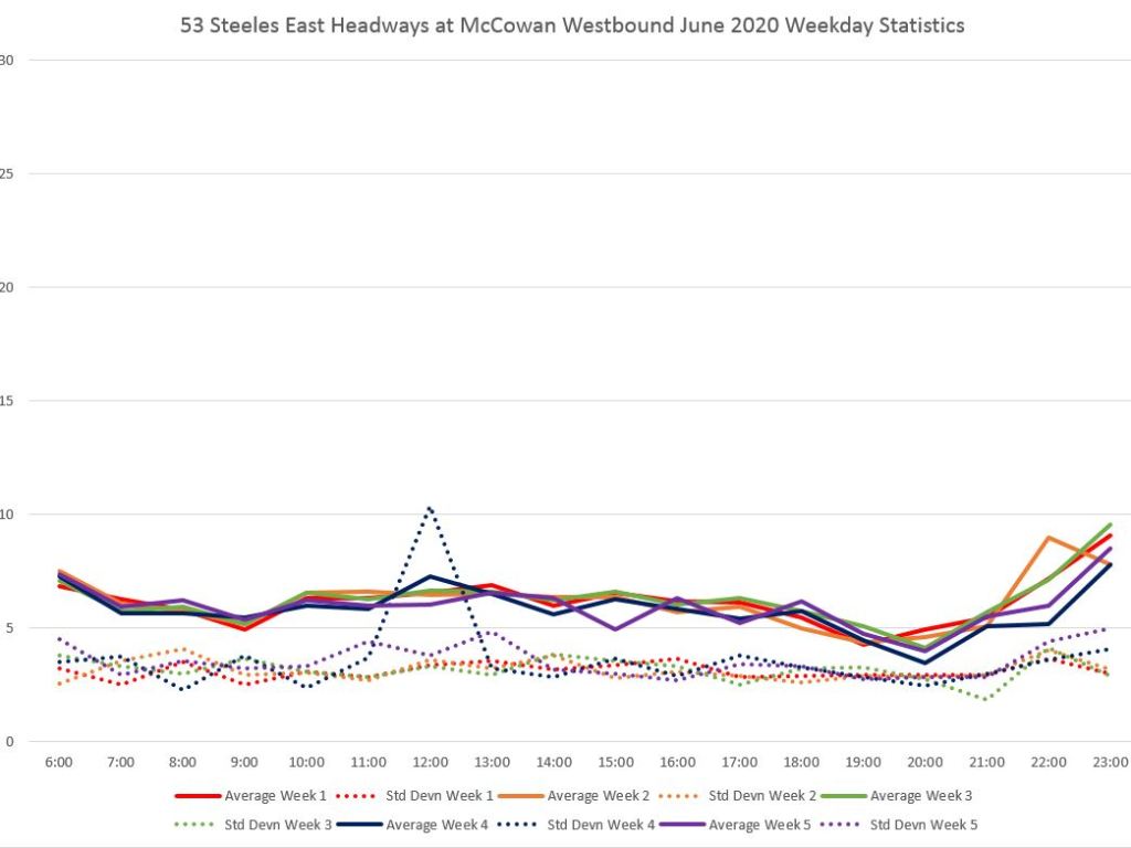 Note: For the charts below, June 2020 data were used because I did not request an extract for this route for July. Week 3 of June is used as a sample, even with some missing data on June 22, because it follows a schedule change on the route for service south of Steeles and reflects conditions through the summer.
