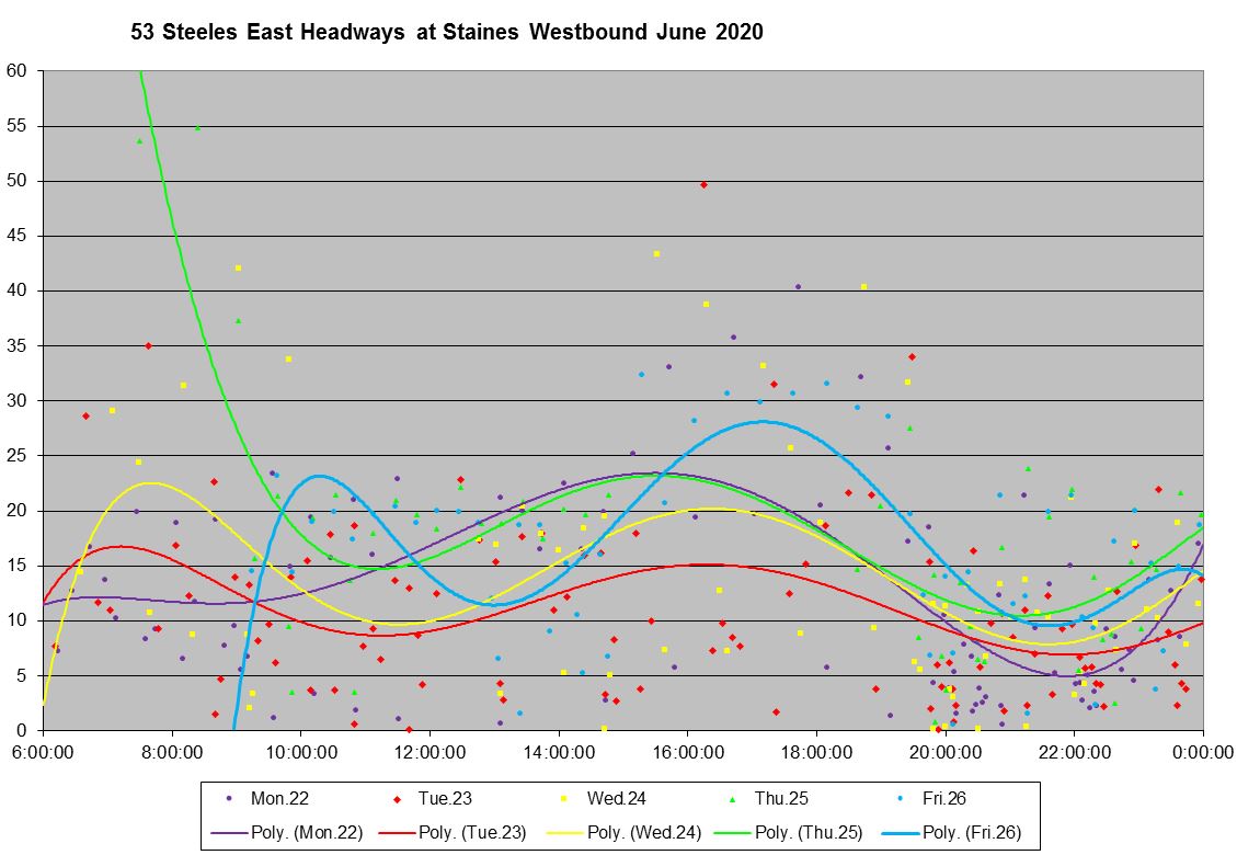 This chart shows the service westbound at Staines as it is reflected in the official schedules. There is no peak service.