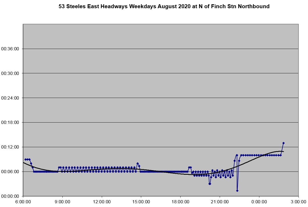 Leaving Finch Station, the service is somewhat better behaved with the headways in a narrower band than we have seen for other routes and locations.