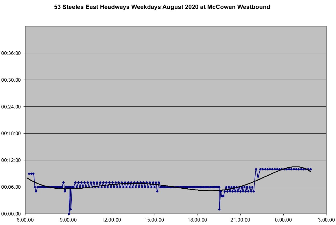Westbound at McCowan, the scheduled service is fairly uniform throughout the day. This route does not have any “tripper” buses.