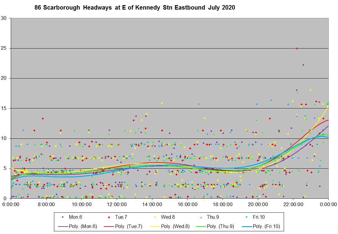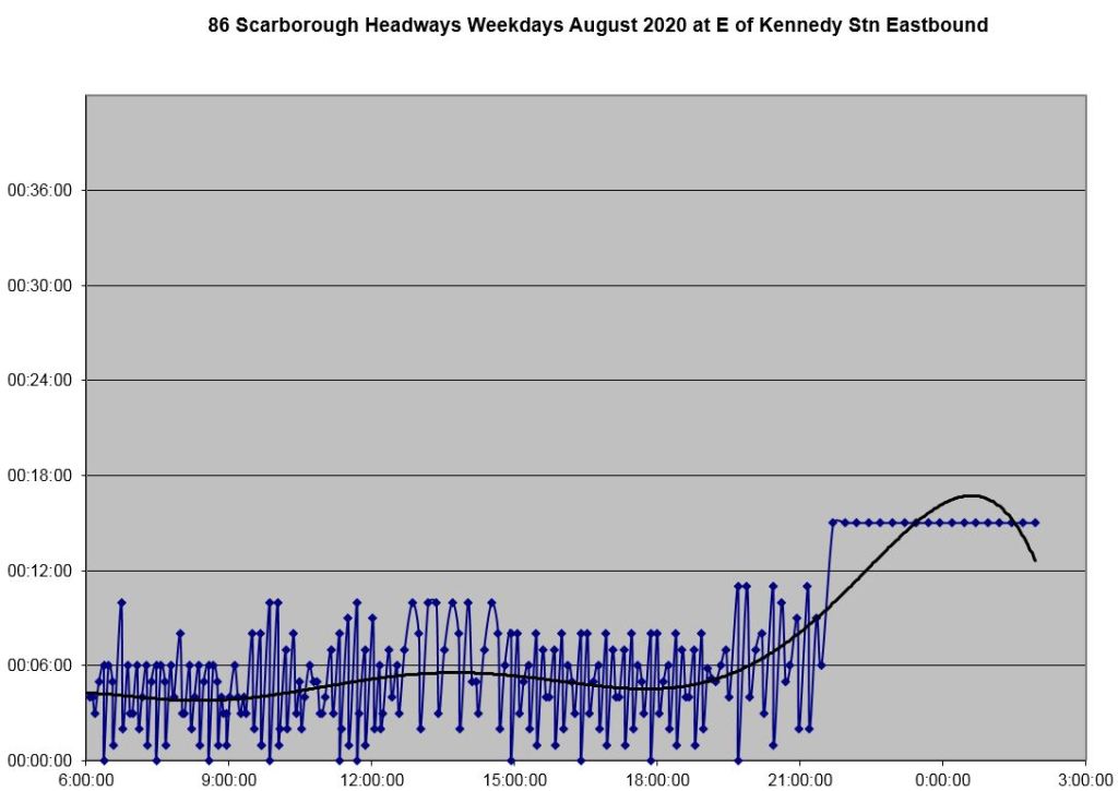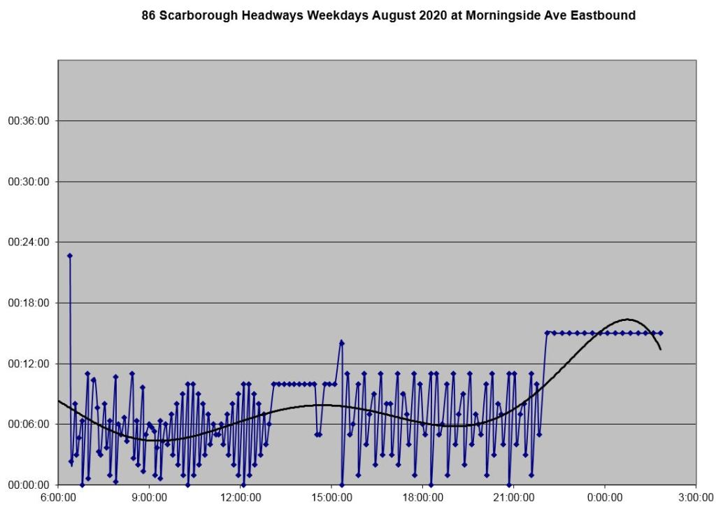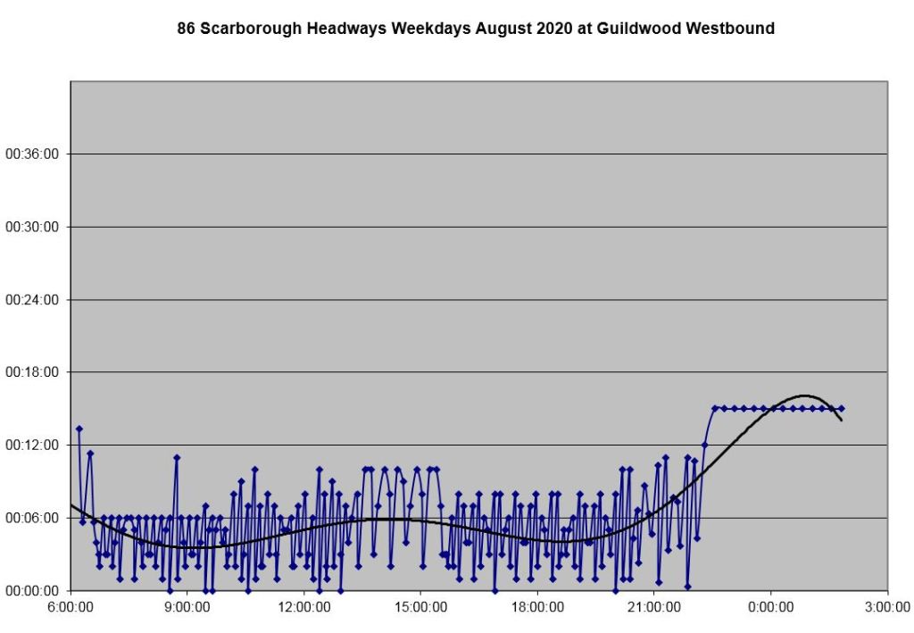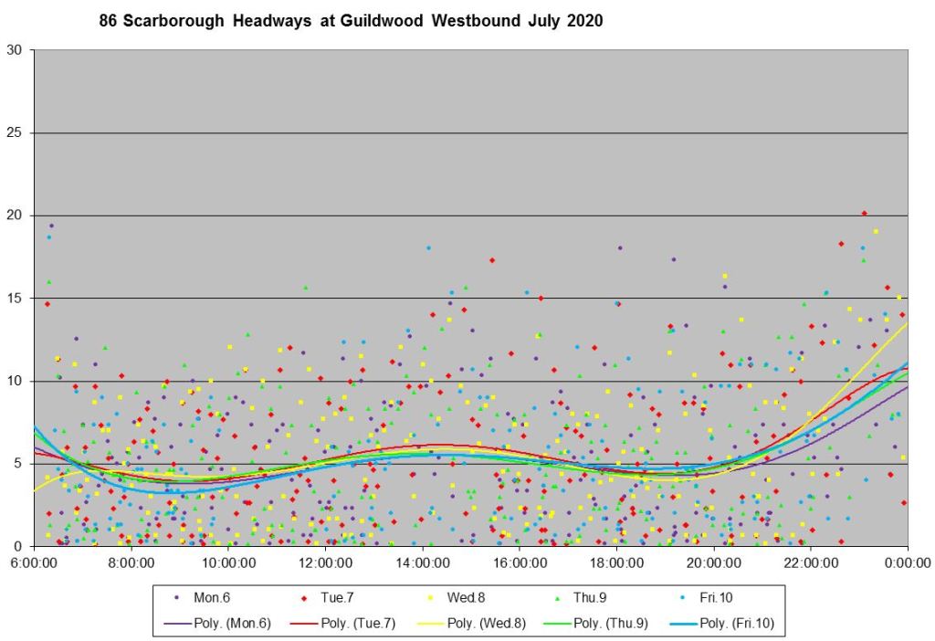 At Kingston Road and Guildwood, the 86D service is also part of the mix and the combined service lies mostly below six minutes, but at uneven headways.