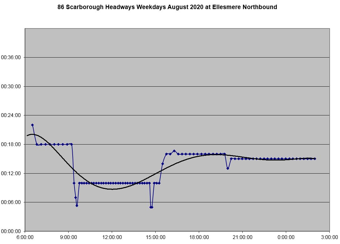 As the scatter chart shows, the actual range of headways is spread over a band nearly 15 minutes wide even though the averages give the impression of a well-behaved service.