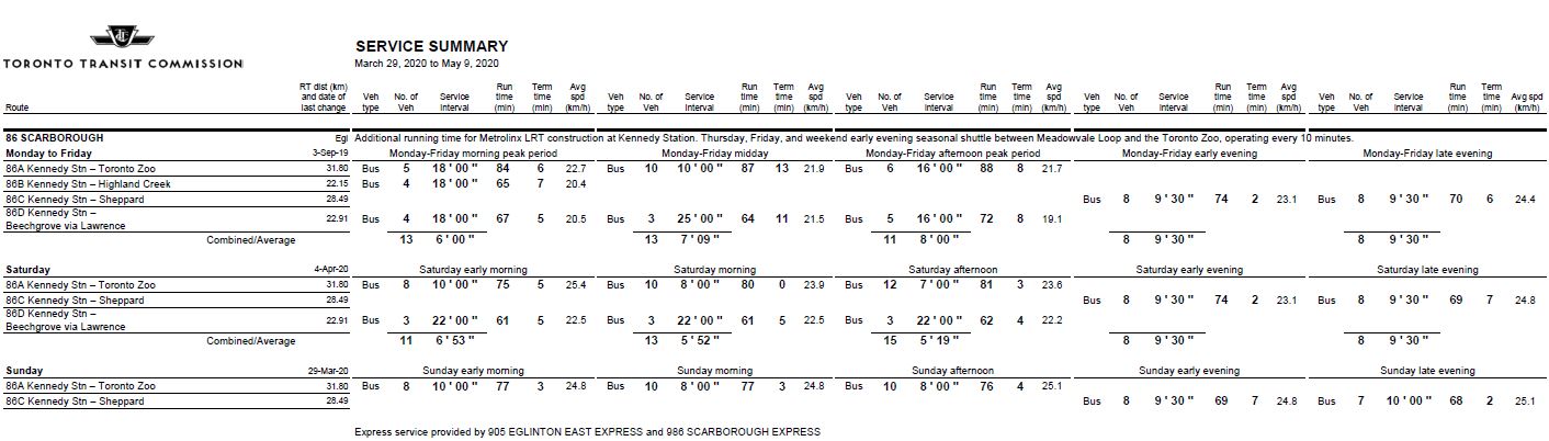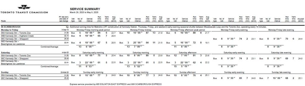 The June 2020 schedules do not include the 9xx express services, but these were partly replaced by improved and extended service on the 86B Highland Creek local.