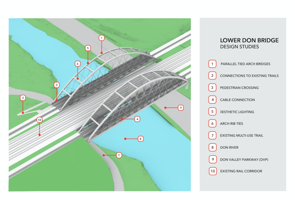 At the Don, the Ontario Line will cross the river on a pair of bridges straddling the GO corridor. These include provision for a pedestrian crossing linking to the trail in the Don Valley.