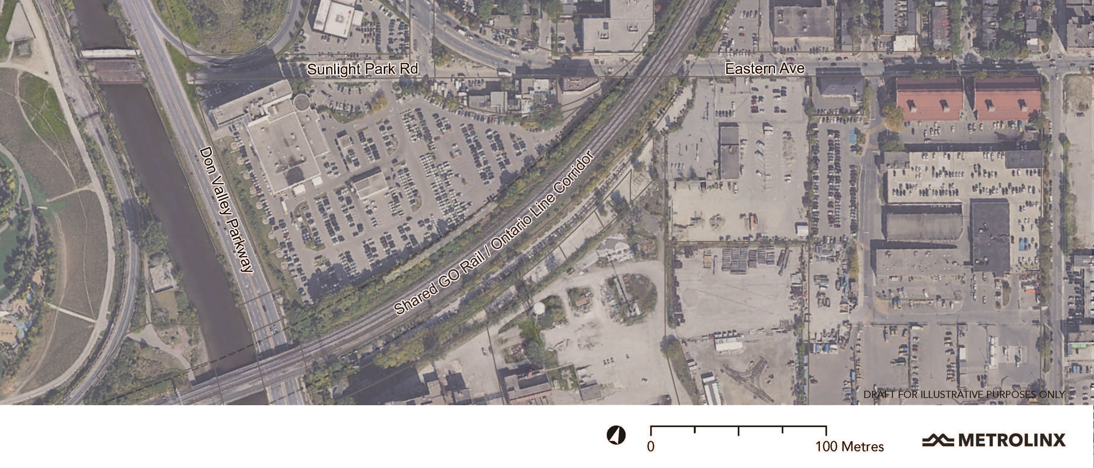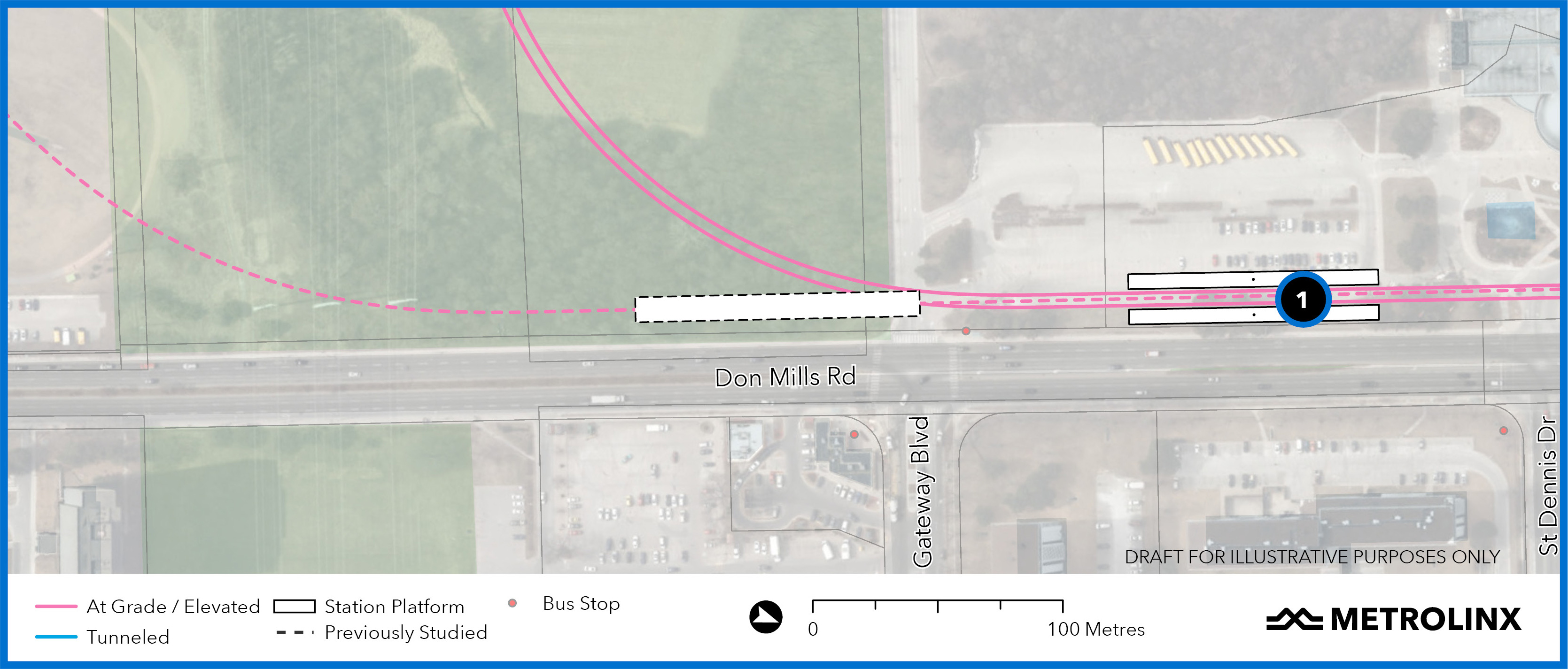 From the east side of the maintenance facility the line runs east and turns north along the west side of Don Mills Road. Flemingdon Park Station would be slightly north of the originally proposed location, and it would be built on an existing parking lot rather than on parkland.