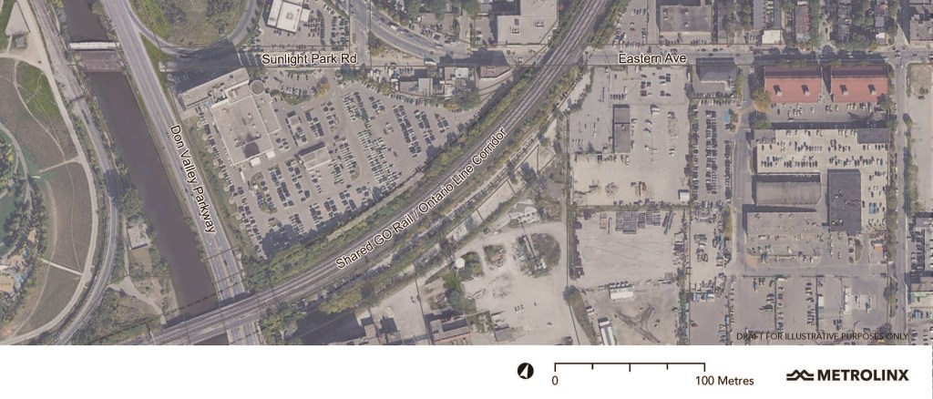 There would have to be an adjusted route because the OL will be “aimed” to stop above grade adjacent to the GO corridor at East Harbour, not under Eastern Avenue.