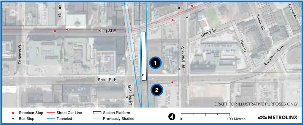 Corktown Station has been shifted to the east side of Berkeley Steret between King and Front to simplify construction. There will be archaeological issues here because this is the First Parliament site as well as possibly a site of indigenous settlement before the Town of York was established.