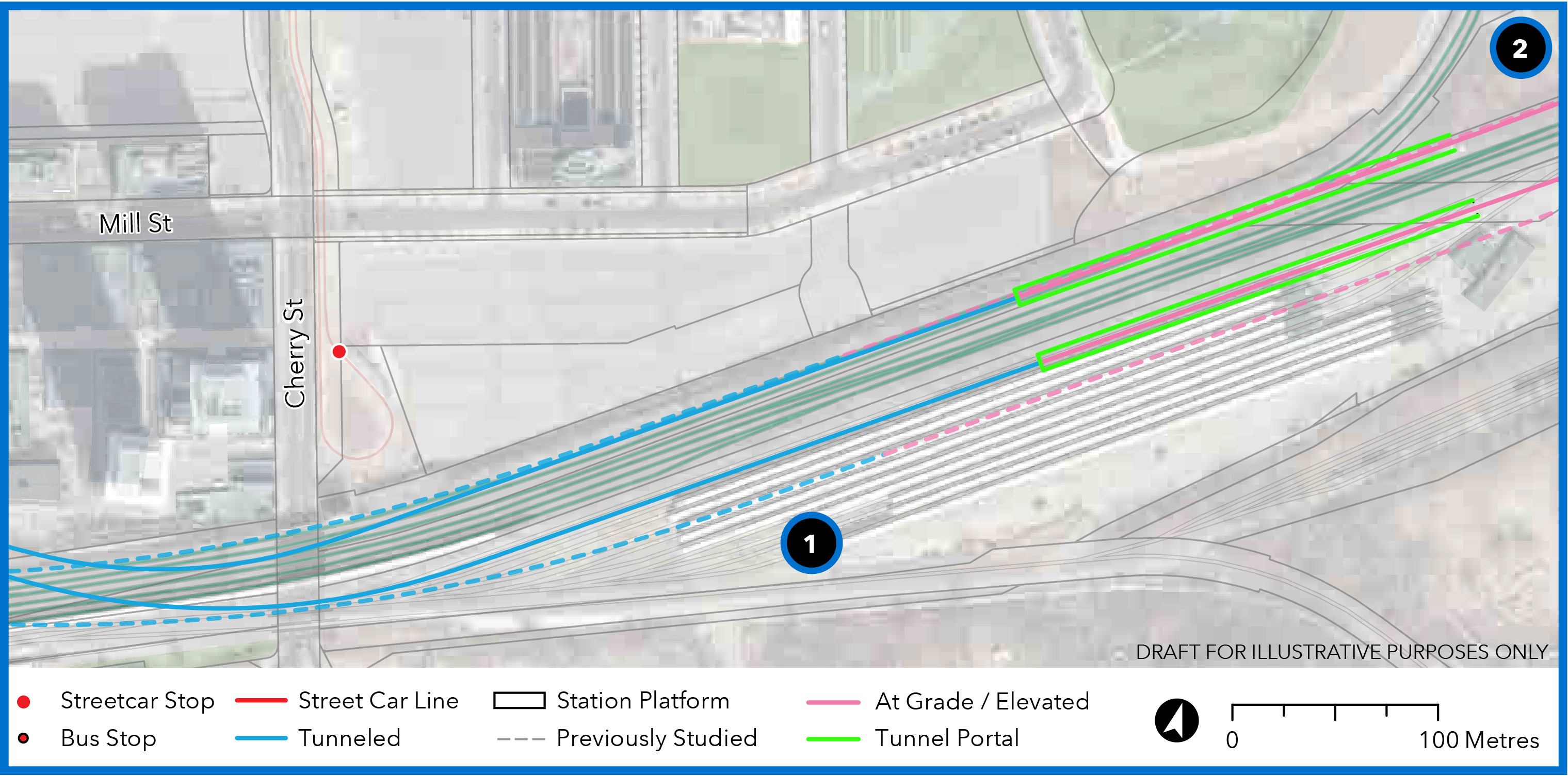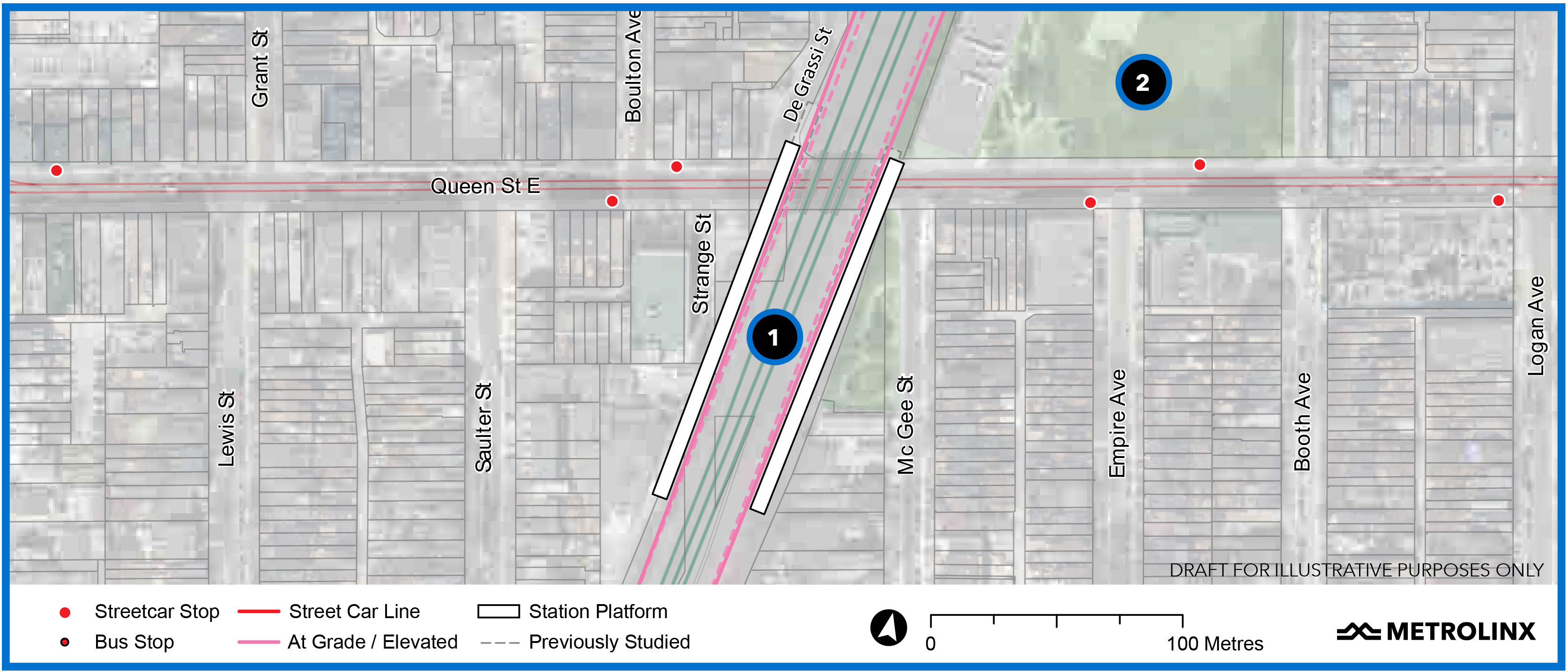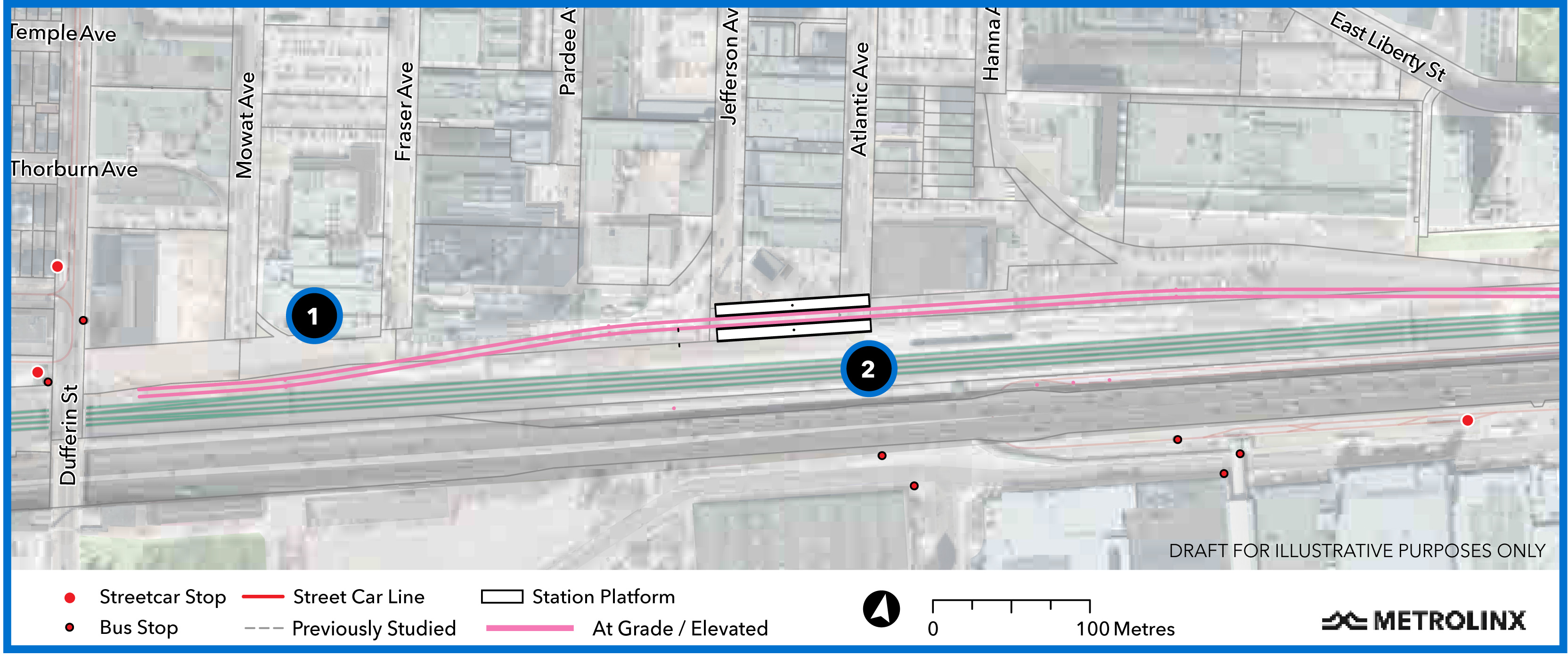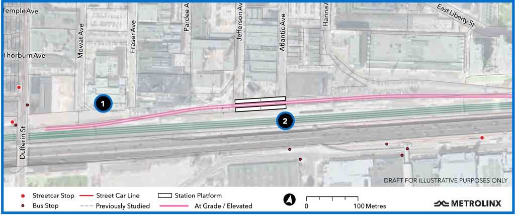 Numbers on the plan below refer to (1) the tail track area west of the station to Dufferin Street and (2) the GO station.