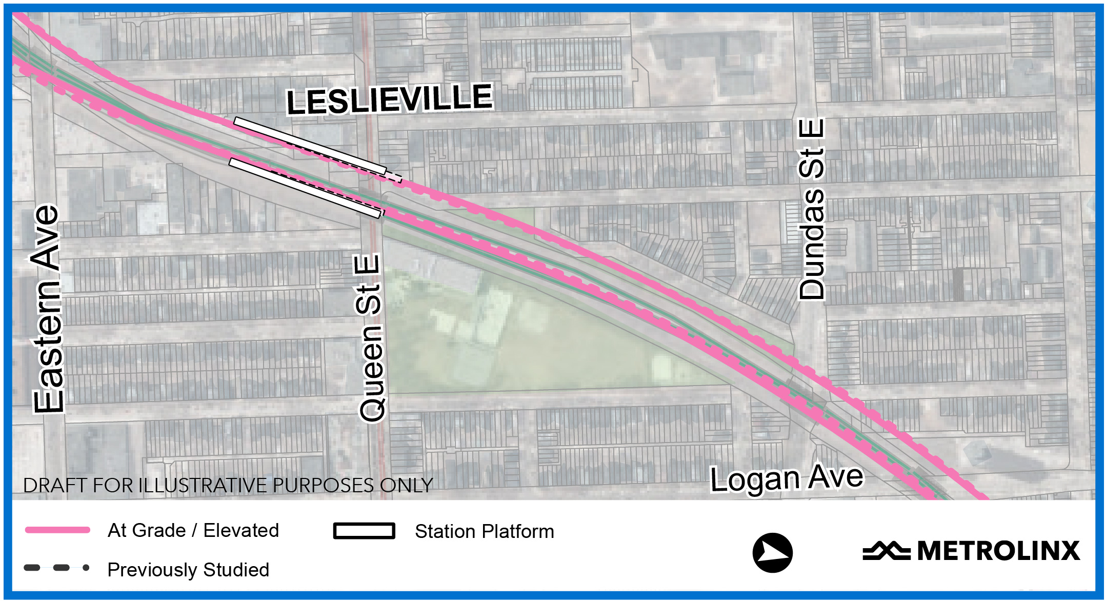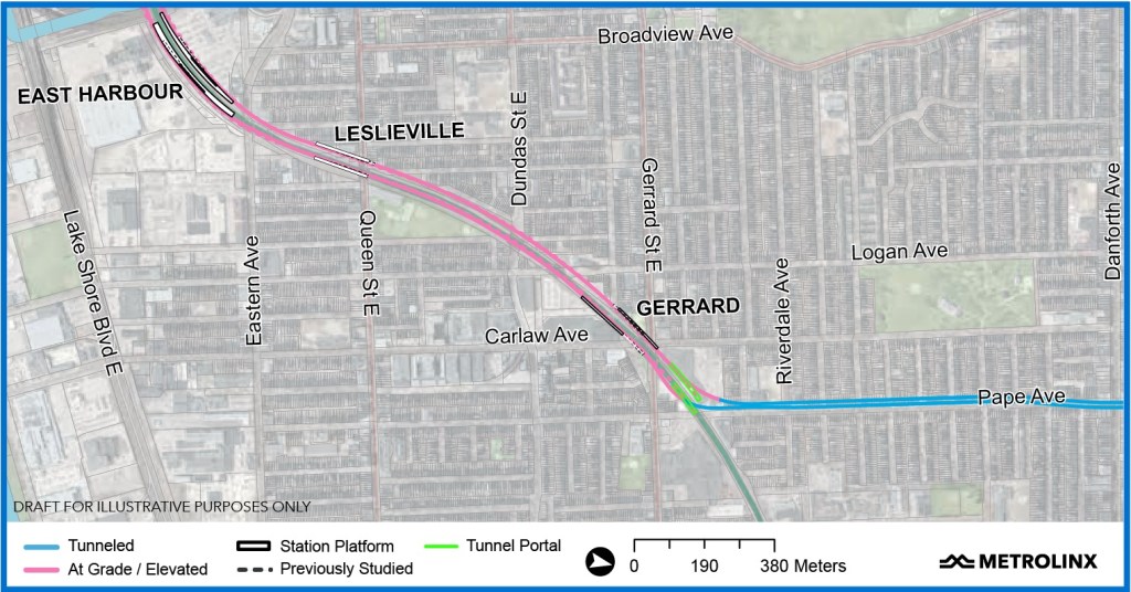 One burning issue in the third segment is the alignment through and effects on the South Riverdale and Leslieville area between East Harbour and Gerrard Stations. Although details on this have not been published, there is a note in a recent Metrolinx report to City Council (linked above) about the area just north of Queen Street where a recreation centre stood in the line’s path.