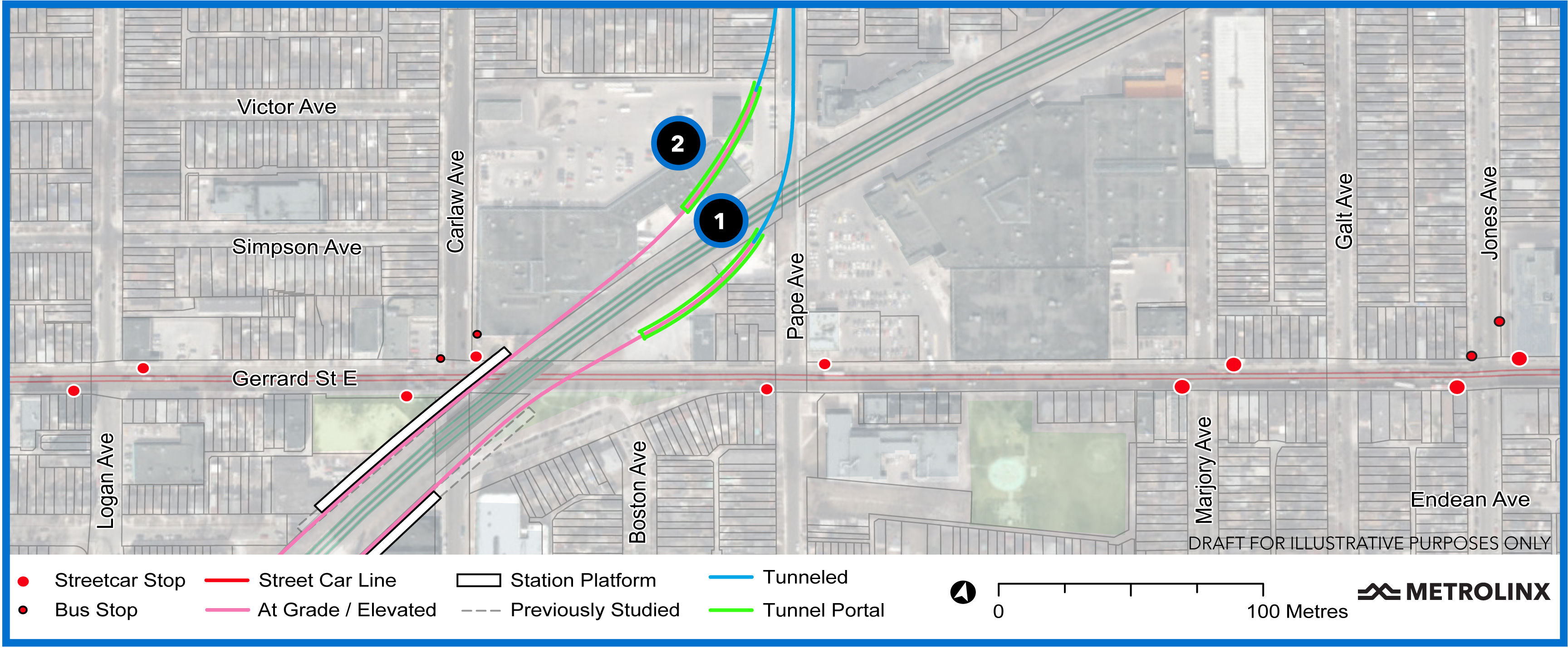 This section of the route includes the Don River crossing, East Harbour and Gerrard Stations, and the southern end of the tunnel that will stretch north via Pape to the Don Valley near the Leaside Bridge.