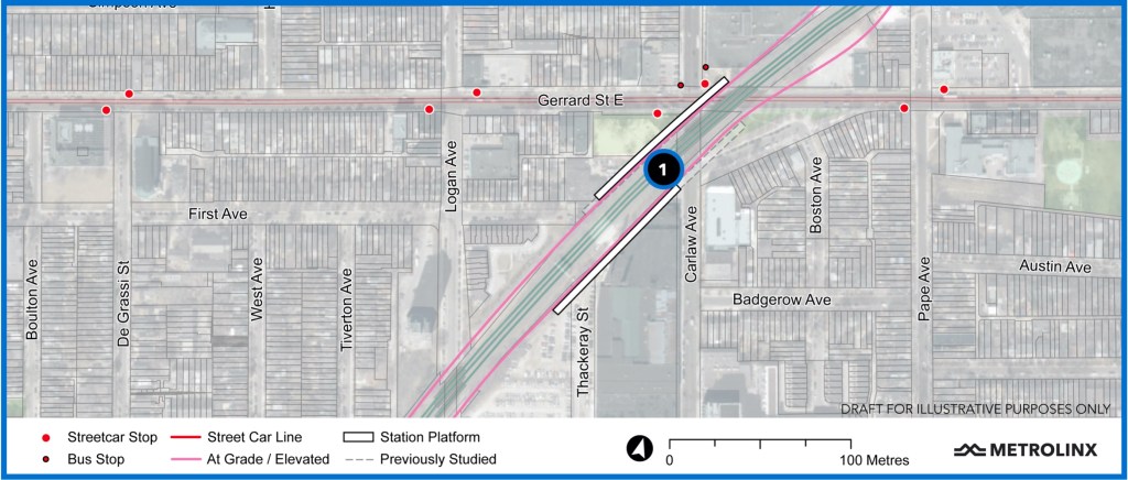 The station and tracks at Gerrard will be integrated with the existing bridges over Gerrard and Carlaw Avenue. The slightly staggered placement of the south platform has been designed to accommodate the beginning of the tunnel portal and eliminate the need for a wider curve to the east to accommodate the turn north.
