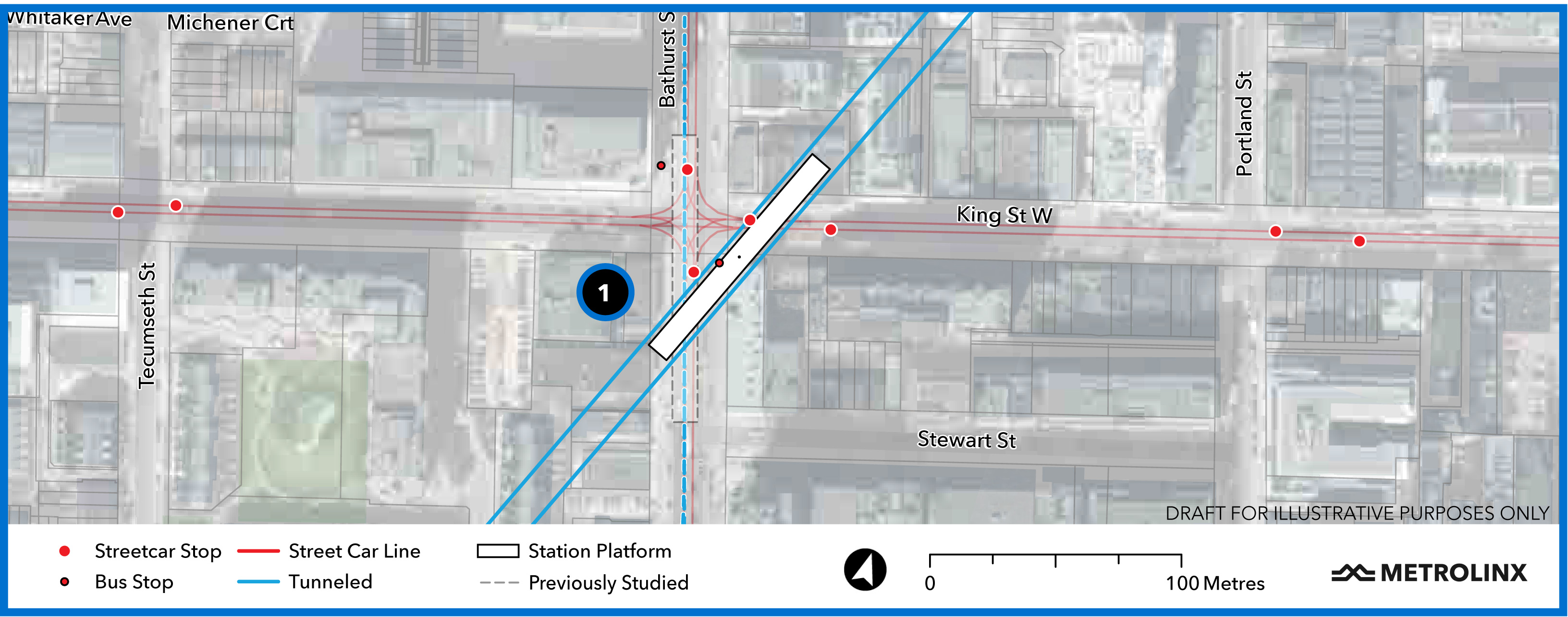 The study area extending east of Exhibition to Dufferin, and up a corridor on Dufferin to north of King is intriguing. Almost as if they were considering one more station further east at King and Dufferin … with the track pointing north. Or perhaps just tailtracks?
