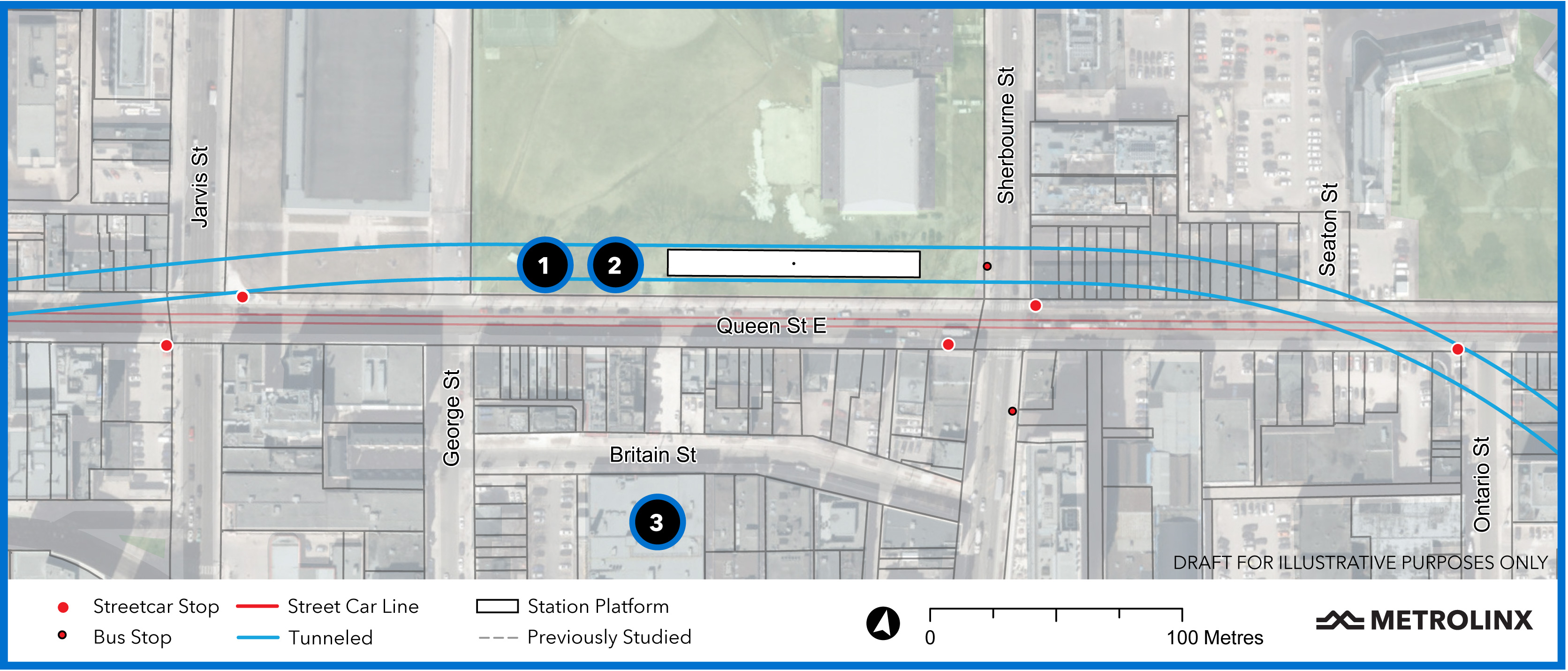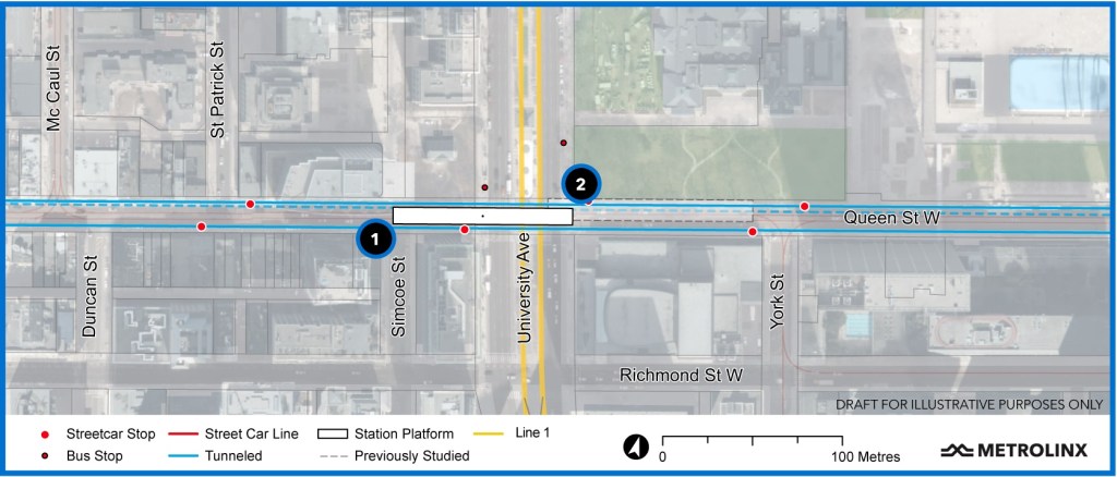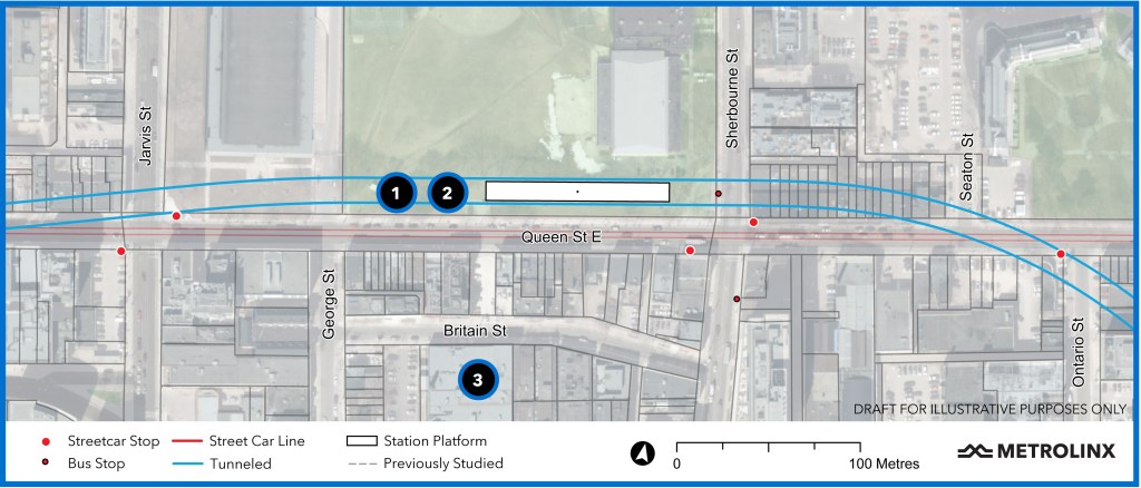 Moss Park Station has been shifted north of Queen into existing open space to simplify station construction. On the original Relief Line this station would have been further east. Metrolinx claims that this station will relieve pressure on streetcar service on Queen, but that is a bit of a stretch given that this is only one stop east of Yonge and there are more closely-spaced stops on the surface.