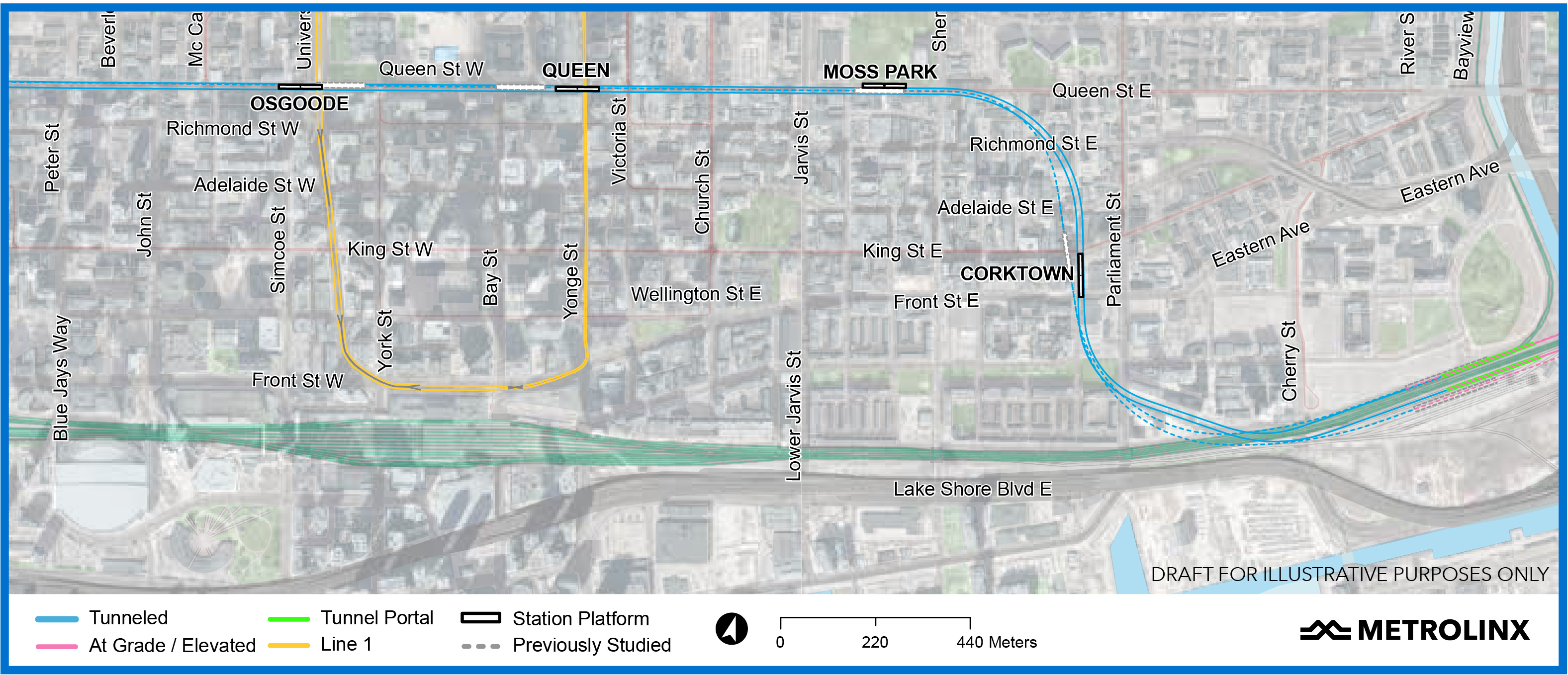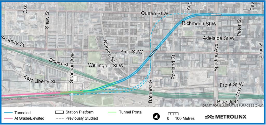 Alignment plans are shown only for the western segment between Exhibition and Queen/Spadina at this point. Metrolinx plans to unveil details of additional segments on a weekly basis for other parts of the line: