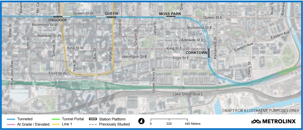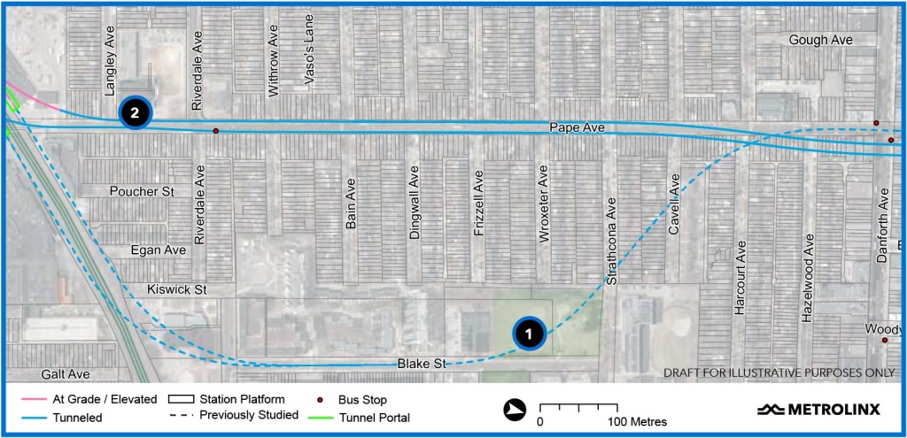 The portals for the transition to underground are shown in the diagram below, but the interesting part comes in the next map. The original Ontario Line design would have continued east to Blake Street, then turned north and eventually swung back west to Pape.