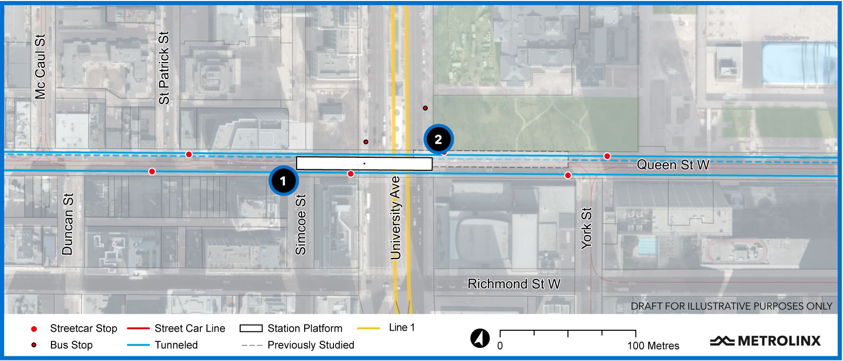 Osgoode Station will lie between the east side of University Avenue and Simcoe Street, a change from earlier designs when it was to be in the block between York and University.