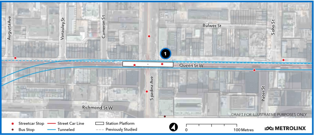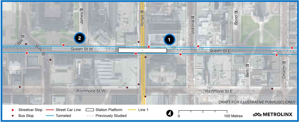 On reaching Queen Street, the tunnel turns straight east under Queen and will follow it across downtown. It is not yet clear where the entrance(s) to the station will be located.