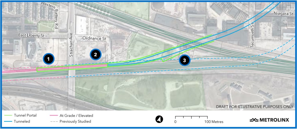 East of Exhibition Station, the line drops to grade to pass under the bridge at Strachan Avenue (1) and then into a tunnel. The launch site for the tunnel boring machine will be east of Strachan Avenue (2) on a site that will eventually be Ordnance Park.