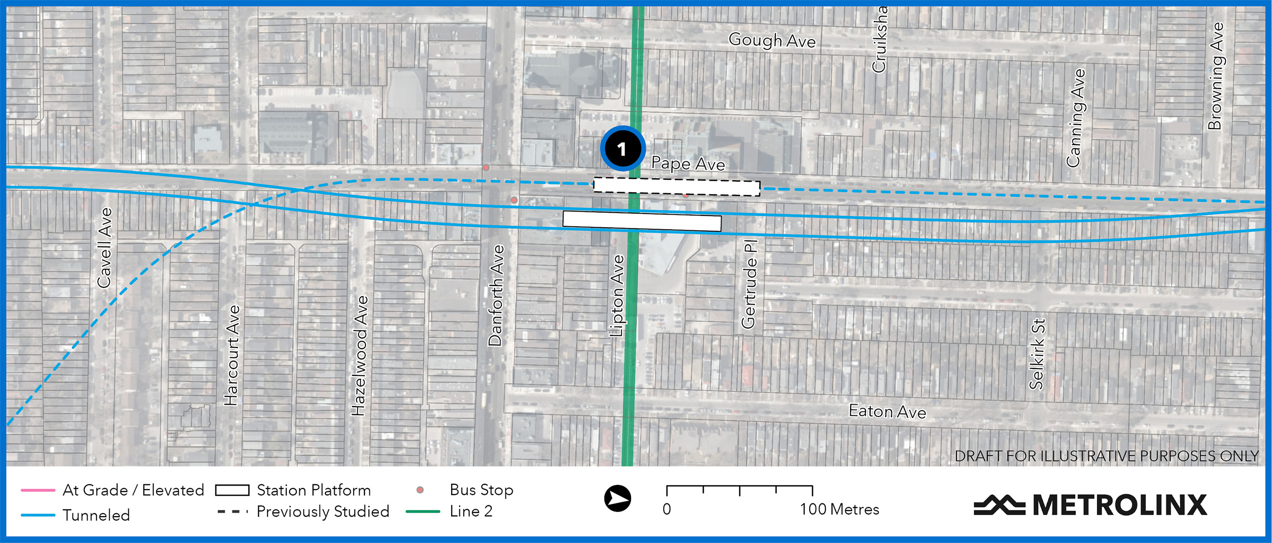 This section of the line will be a deep tunnel that would go under houses as shown on the map. Property requirements for construction would only be in the vicinity of Pape Station. With the station shifted east of Pape, the need for a major excavation under the roadway is eliminated.