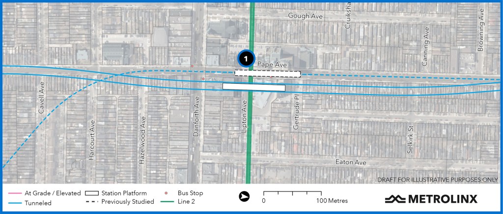 Another change visible in the map above is that the OL has been shifted east of Pape at Danforth rather than crossing in the middle of Pape Avenue as shown on the original OL and Relief Line plans. We will see more details of that when the North Section is unveiled next week.