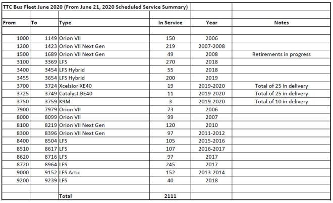 In a previous article, I wrote about the existing fleet. Here is a table of the current fleet as of June 2020. The current policy for the replacement cycle is to use buses until they are 12 years old, although the TTC is still in a transitional stage between their former 18 year policy and the new one. Purchase of new buses is tied to the rate at which old ones come up for replacement.