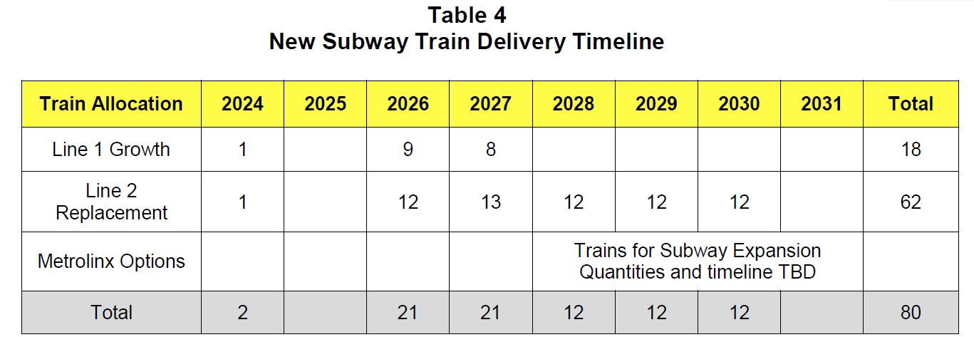 The delivery period for new Line 2 trains is in the latter half of this decade, 2026-2030. It is essential that the new fleet be in place before the Scarborough extension opens if that line has only ATC signalling. Earlier plans, which had the Scarborough line opening in the mid 2020s, would have required a temporary system to permit operation of non-ATC T-1 trains over the new line.